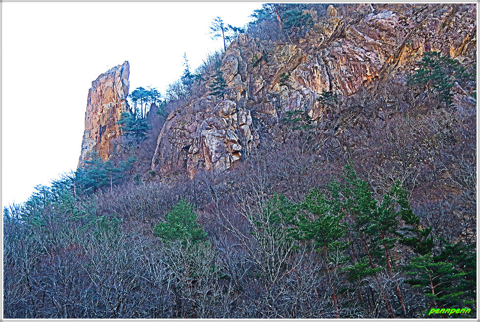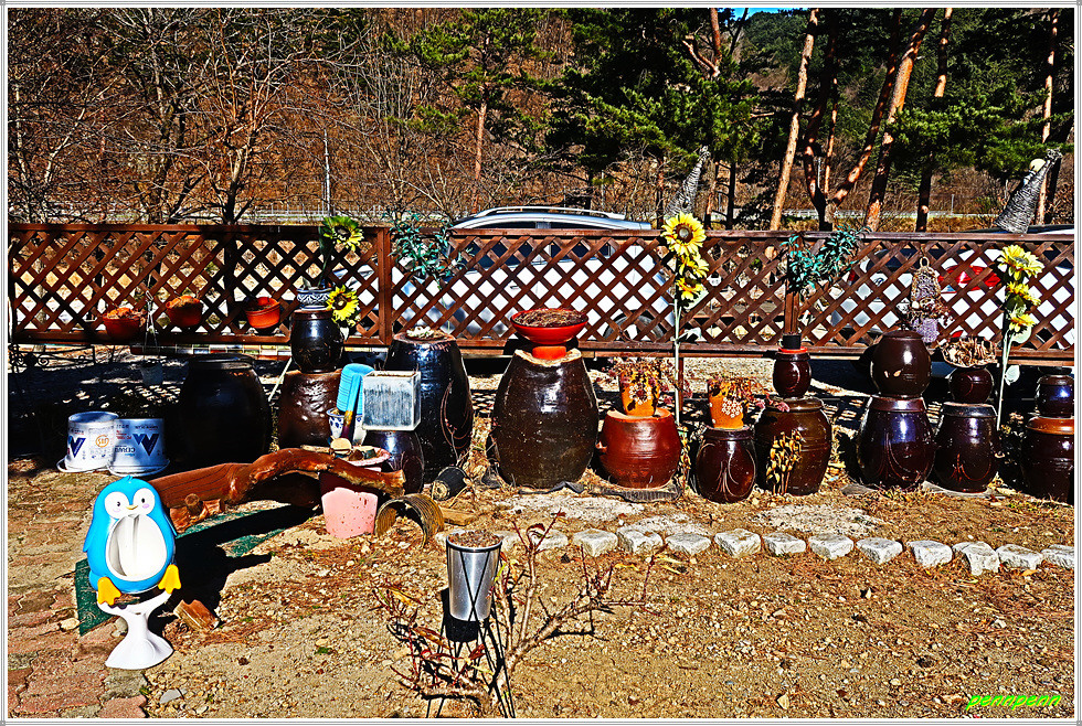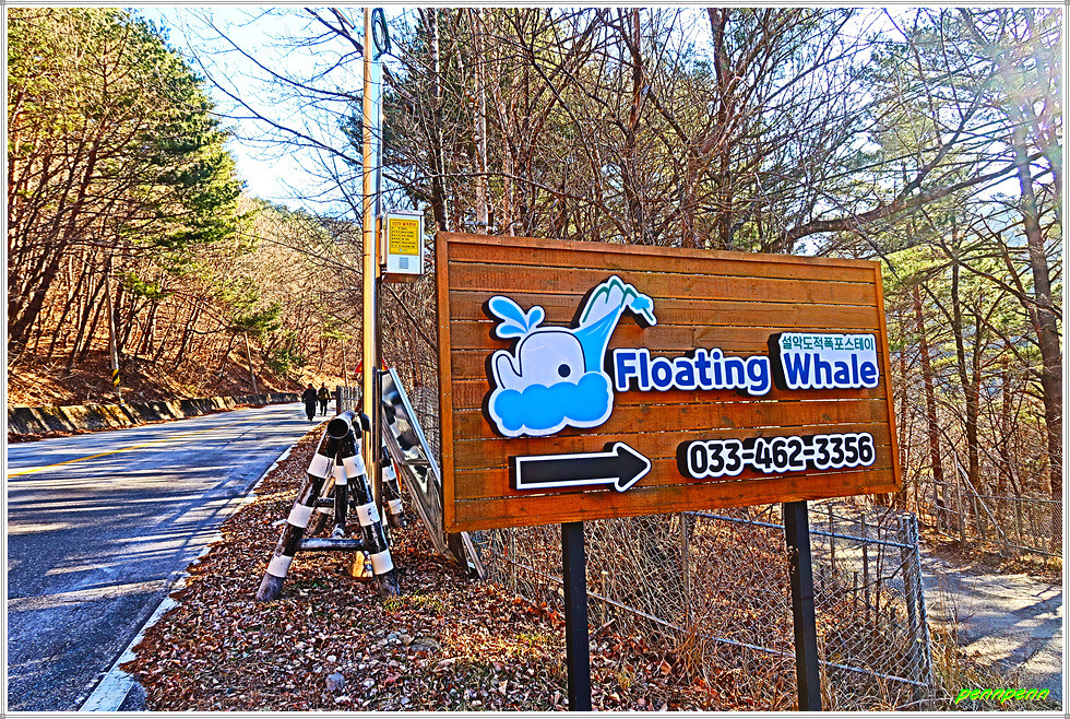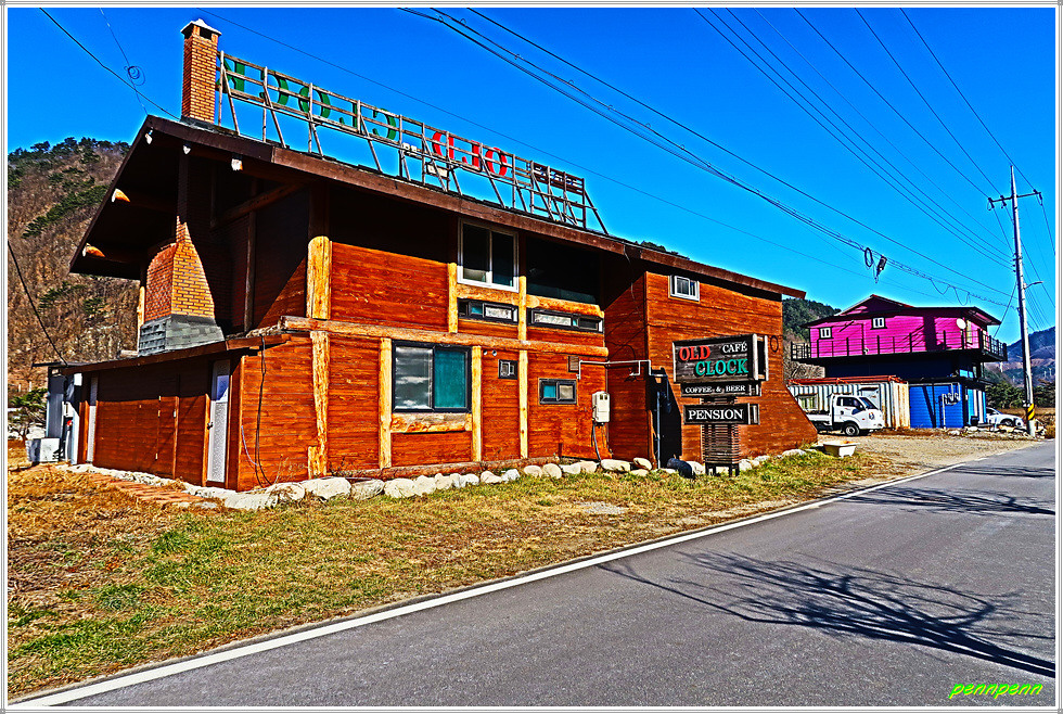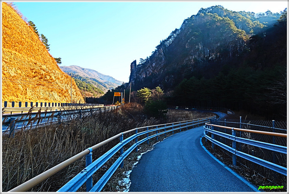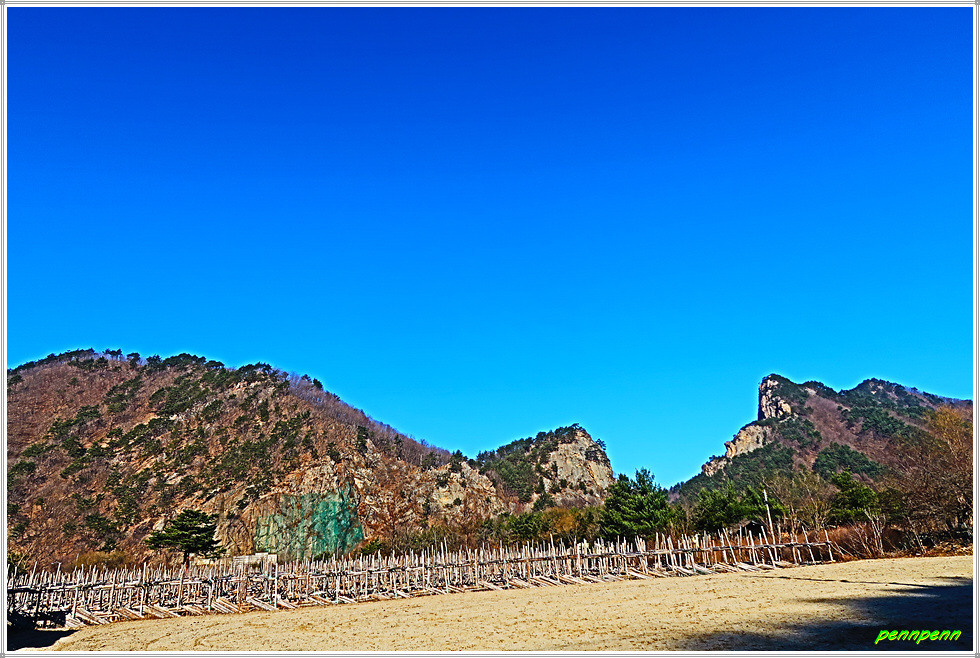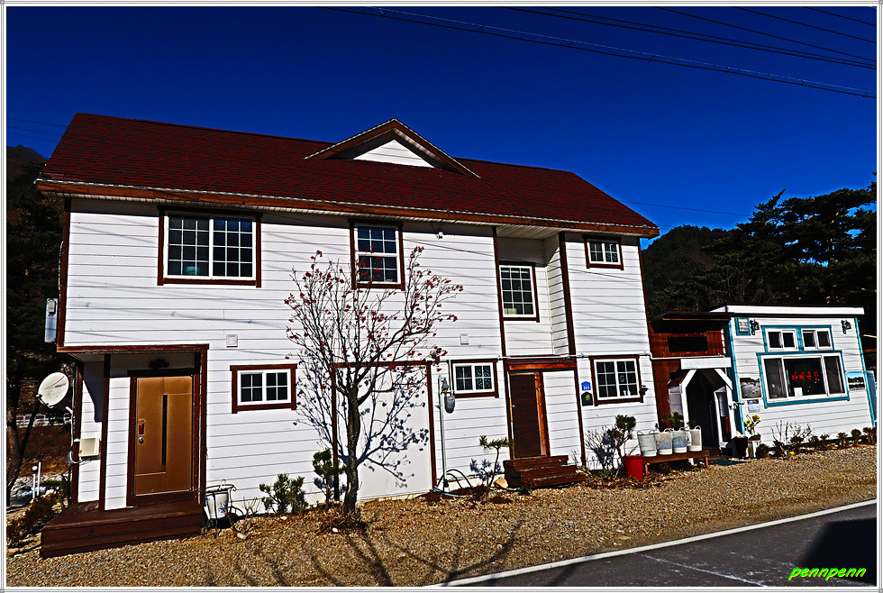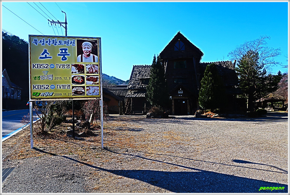 이제부터는 본격적인 황태마을입니다. 다리골교 옆을 지나면 도로 좌우로 큰 규모의 황태덕장이 나타납니다. 내설악 백공미술관을 뒤로하고 발걸음을 옮기면 황태덕장 뒤로 마치 유럽 알프스의 마테호른 축소판 같은 암봉이 보이는데 바로 좌측 암봉이 인공폭포가 있는 매바위입니다. 건축물의 형식이 매우 이국적인 소풍이라는 이름의 황토펜션은 TV방송에도 소개되었다고 합니다.