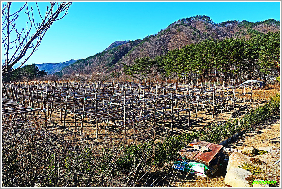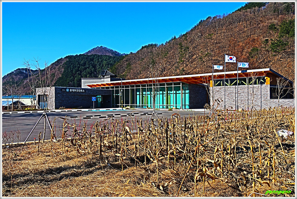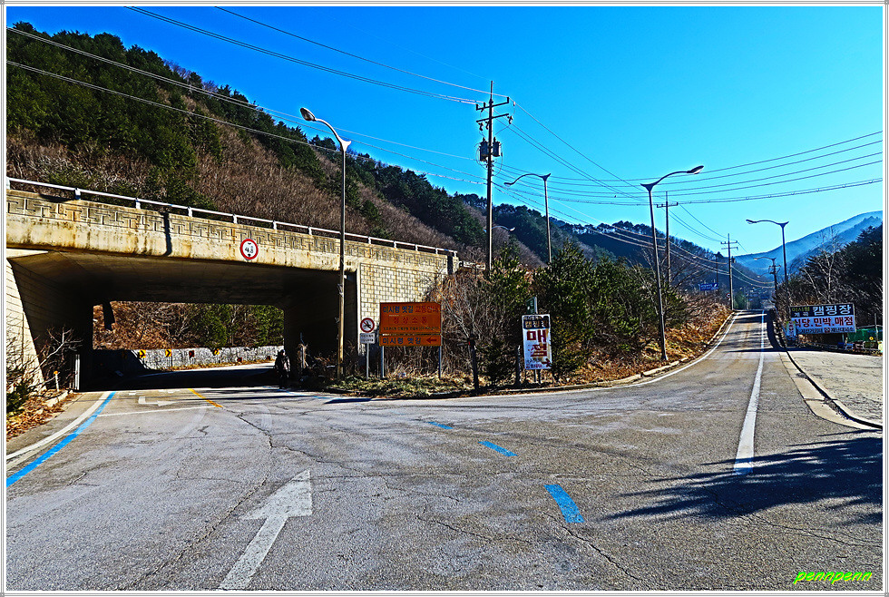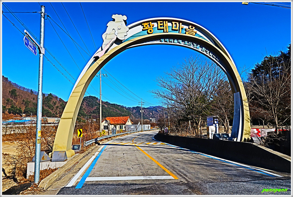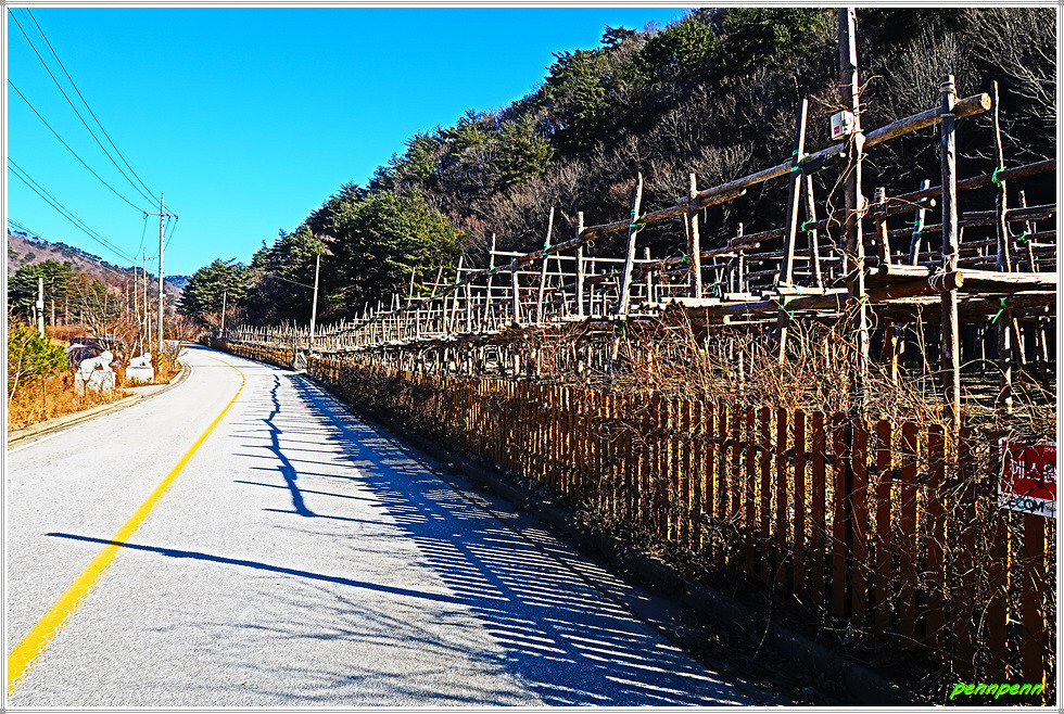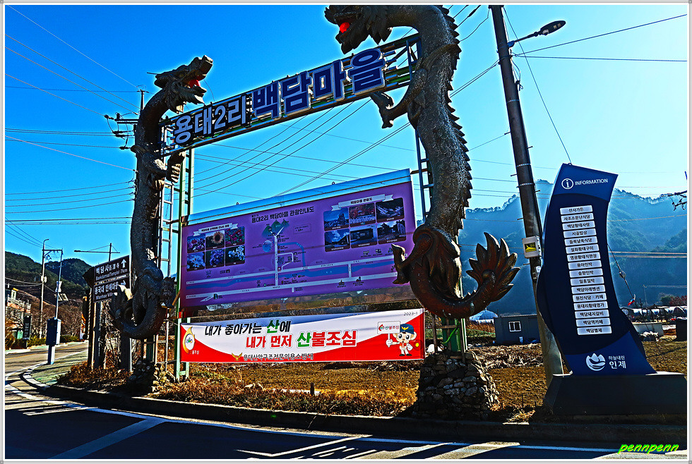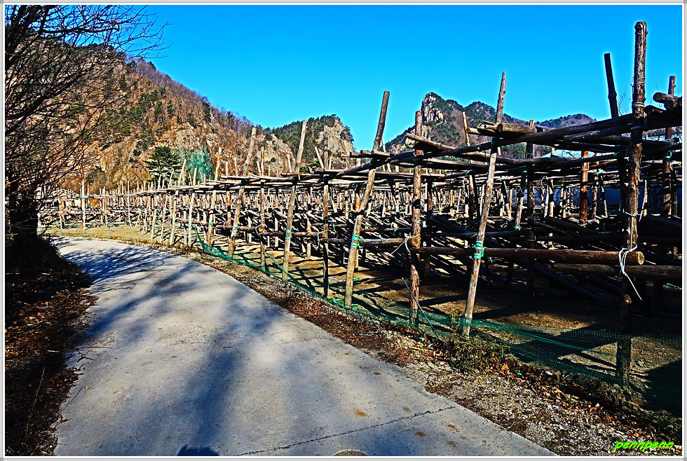 용대2리 백담마을은 동국대 만해마을에서 2km 지점으로 백담사를 가려면 여기서 남쪽으로 7km를 더 가야합니다. 용대보건진료소를 뒤로하면 황태마을에 온 것을 환영한다는 아취형 조형물이 반겨주는데 이후 황태촌까지는 도로 좌우로 황태덕장이 늘어서 있습니다. 주민들은 눈이 내리는 추위에 대비해 덕장을 손질하고 있더군요.