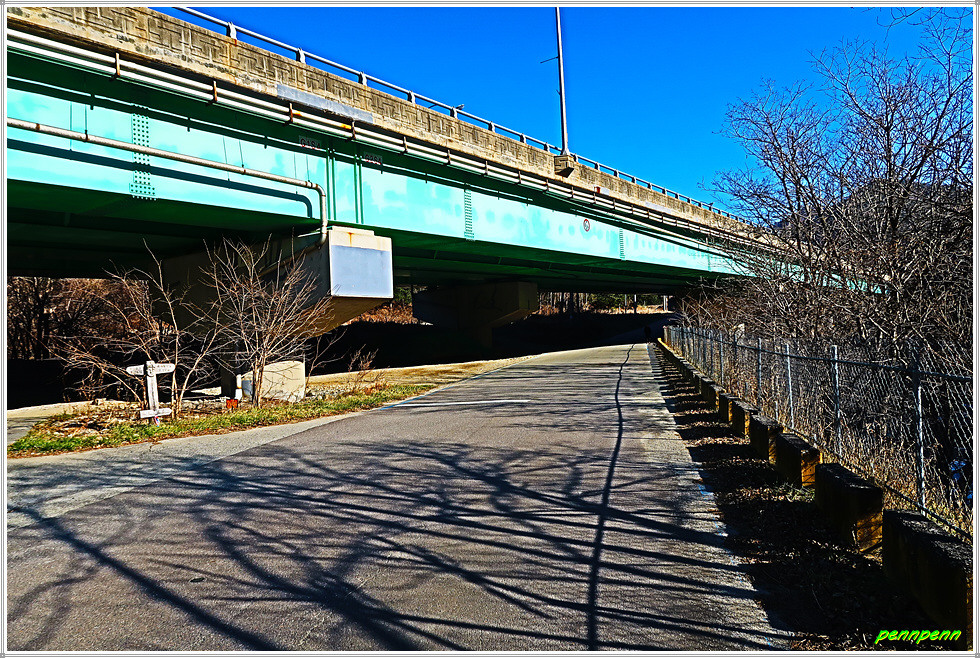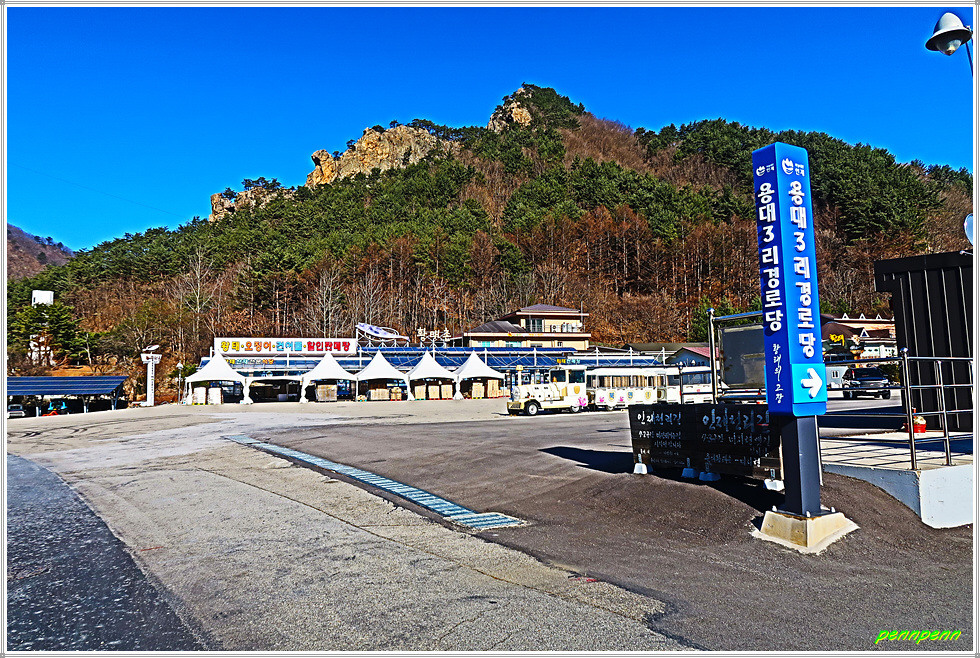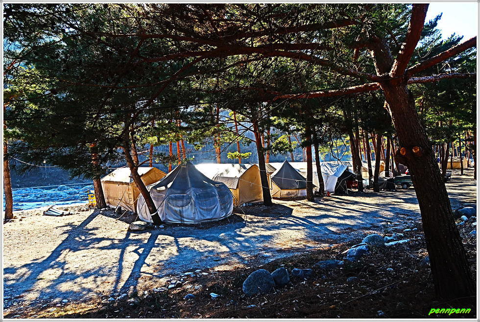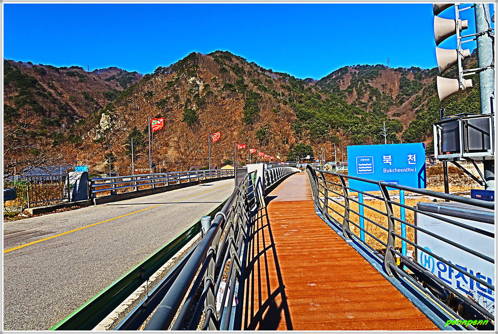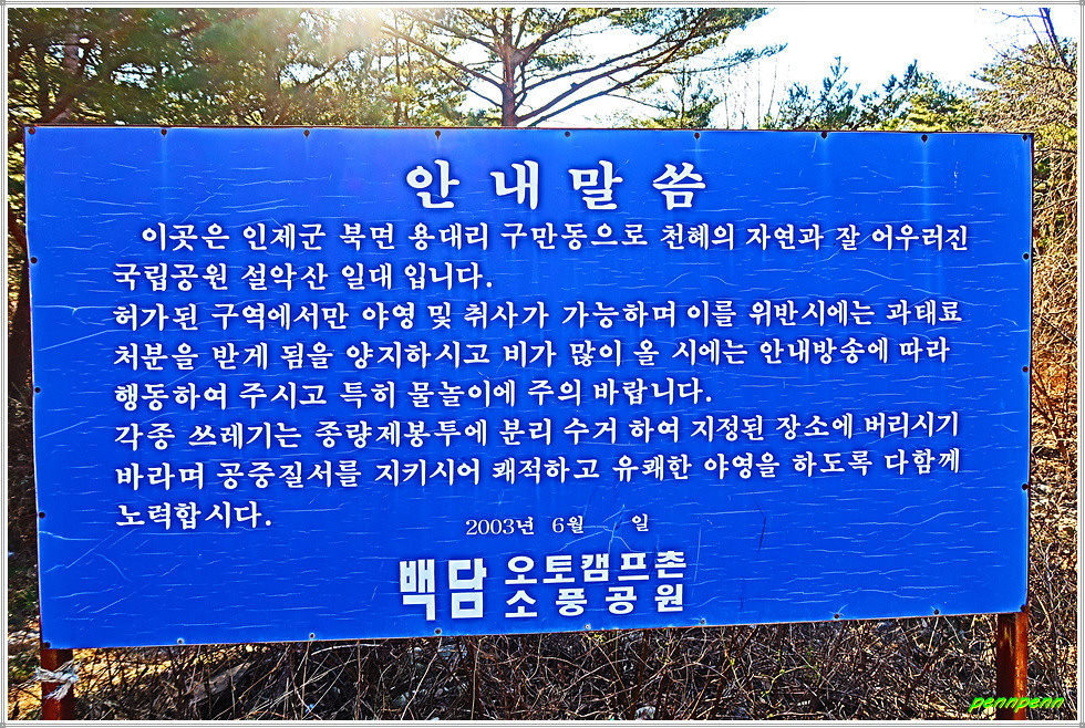 15코스 출발점은 만해마을 인근 대형 주차장이 있는 용대관광지 교차로입니다. 교차로에서 주차장 안쪽으로 조금 들어서면 동국대 만해마을 이정표가 있는데 이에 의거 좌측으로 몸을 돌려세웁니다. 길의 우측 북천변에는 솔밭야영장이 있고, 만해교로 가는 길목의 좌측에는 넓은 솔밭이 펼쳐져 있습니다. 만해교를 건너며 바라본 북천의 바닥에는 암석이 굉장히 많더군요.