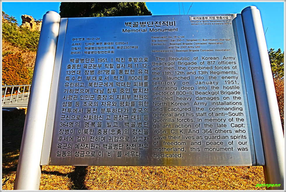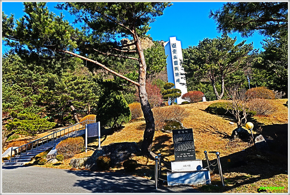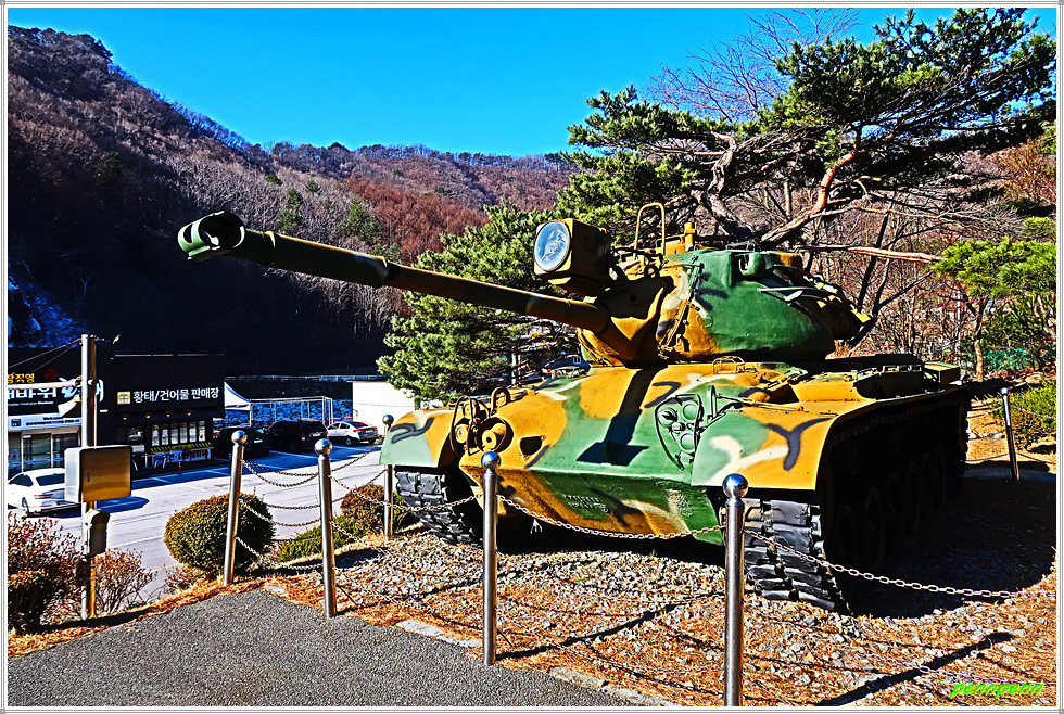 인공폭포 맞은편 백골병단 전적비는 한국 최초의 유격대로 창설된 640명의 백골병단 대원들이 설악산에서 적을 교란함으로써 아군 작전에 기여하는 전공을 세워 이들을 기리고 순국 산화한 장병의 명복을 빌고자 건립한 비입니다. 전적비 앞에는 탱크가 전시되어 있지요.