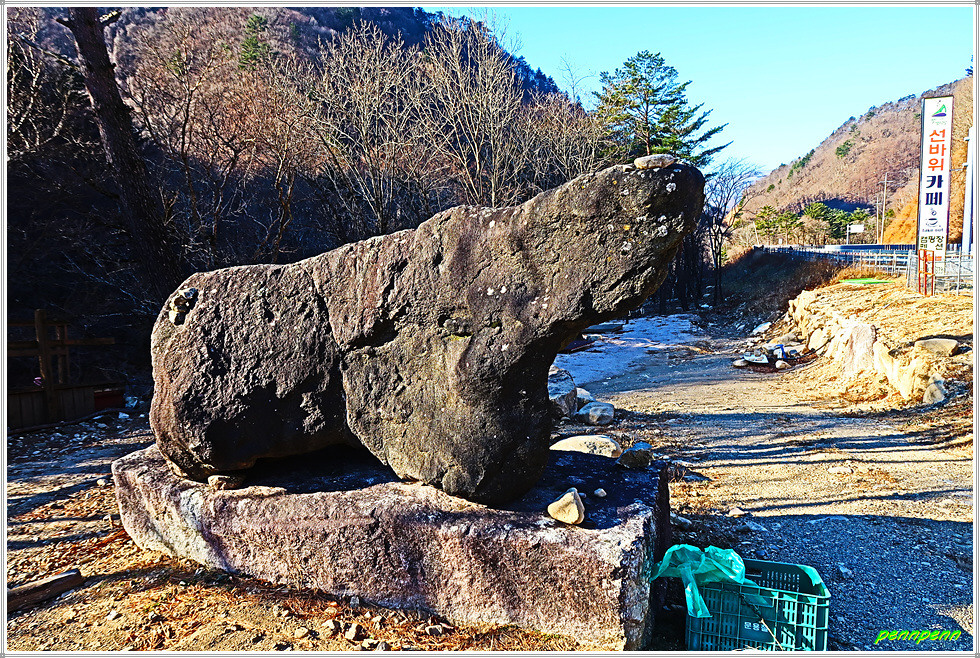 옥수1교 입구로 되돌아와 좌측 56번 지방도로가 지나가는 교량 아래로 갑니다. (구)용대1교를 건너 미시령 설악집 앞을 지나 우측 굴다리를 통과하면 멀리 선바위가 보이기 시작하네요. 점점 가까이 다가서면 선바위가 더욱 웅장하게 보이고 지나서 되돌아보면 가장 멋진 선바위의 모습을 볼 수 있습니다. 선바위카페에 놓여 있는 곰 바위는 그야말로 곰의 형상입니다.