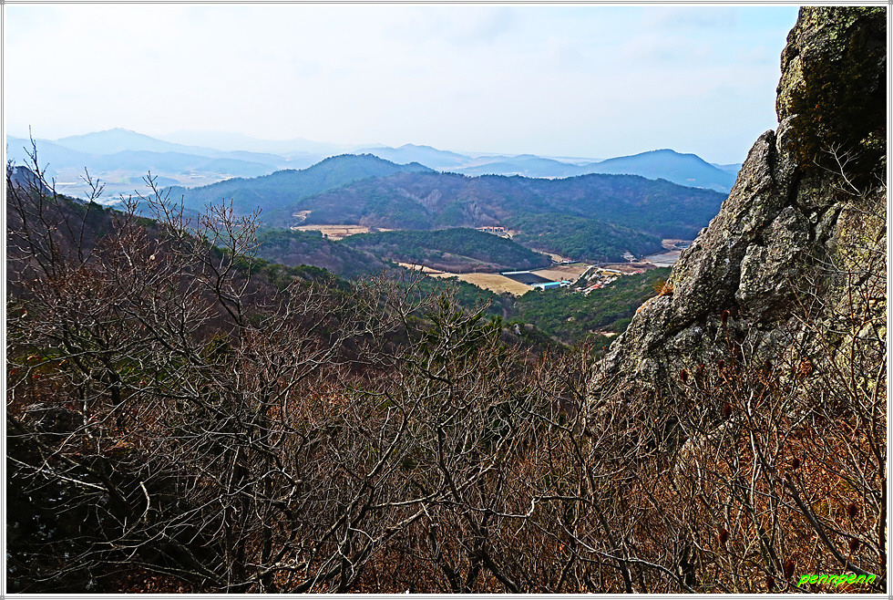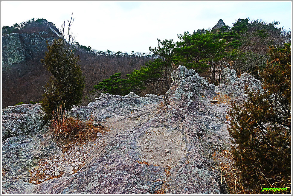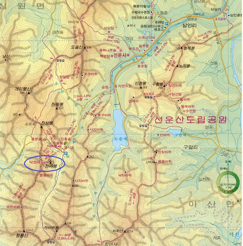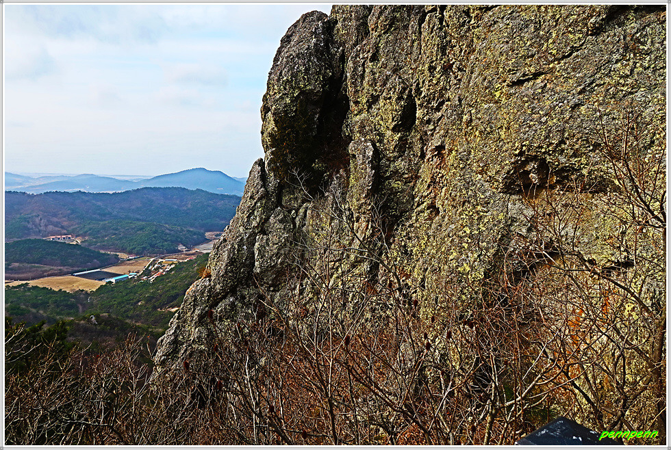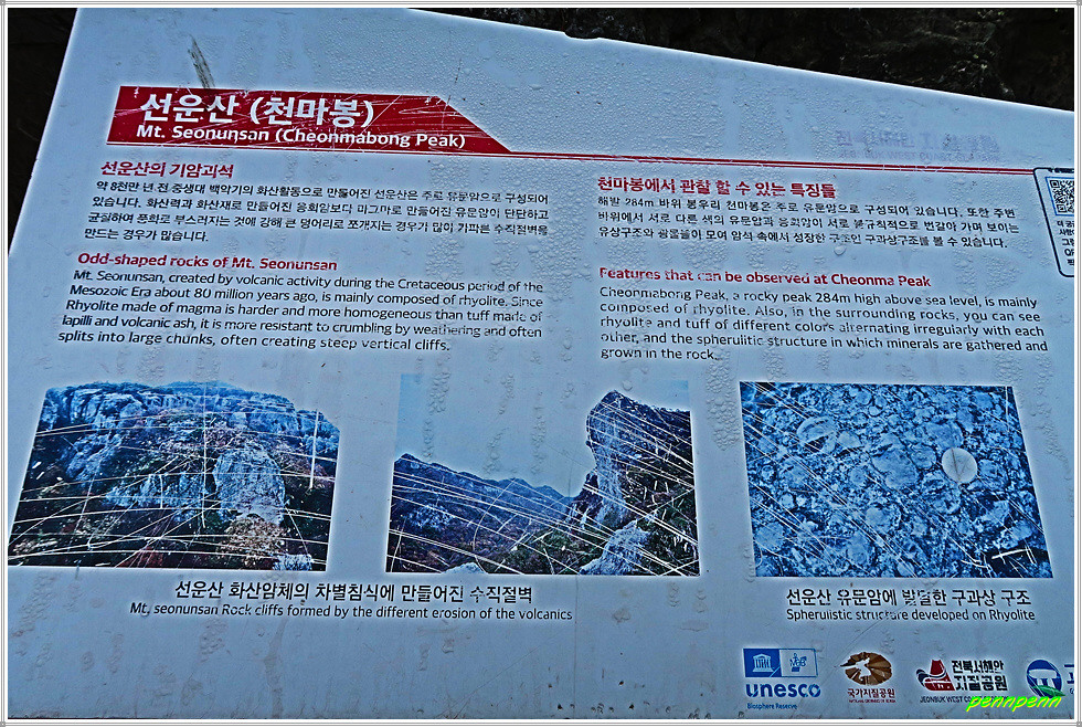 낙조대에서 동쪽 천마봉까지의 거리는 200m입니다. 낙조대 남쪽으로 가파른 철계단이 있는 곳의 병풍바위도 장관이고, 가는 길목에 내려다본 북동쪽 선운산의 기암괴석과 도솔암의 경관은 정말 멋집니다. 약 8천만 년 전 중생대 백악기의 화산활동으로 만들어진 선운산은 주로 유문암(규산염 함량이 높은 화산암의 대표격인 암석)으로 구성되어 있습니다. 마그마로 만들어진 유문암은 화산력과 화산재로 만들어진 응회암보다 단단하고 균질하여 풍화로 잘 부서지지 않고 큰 덩어리로 쪼개지는 특성으로 인해 가파른 수직절벽을 만드는 경우가 많습니다. 천마봉에서 관찰할 수 있는 바위들은 이러한 특징들을 잘 보여주고 있습니다.