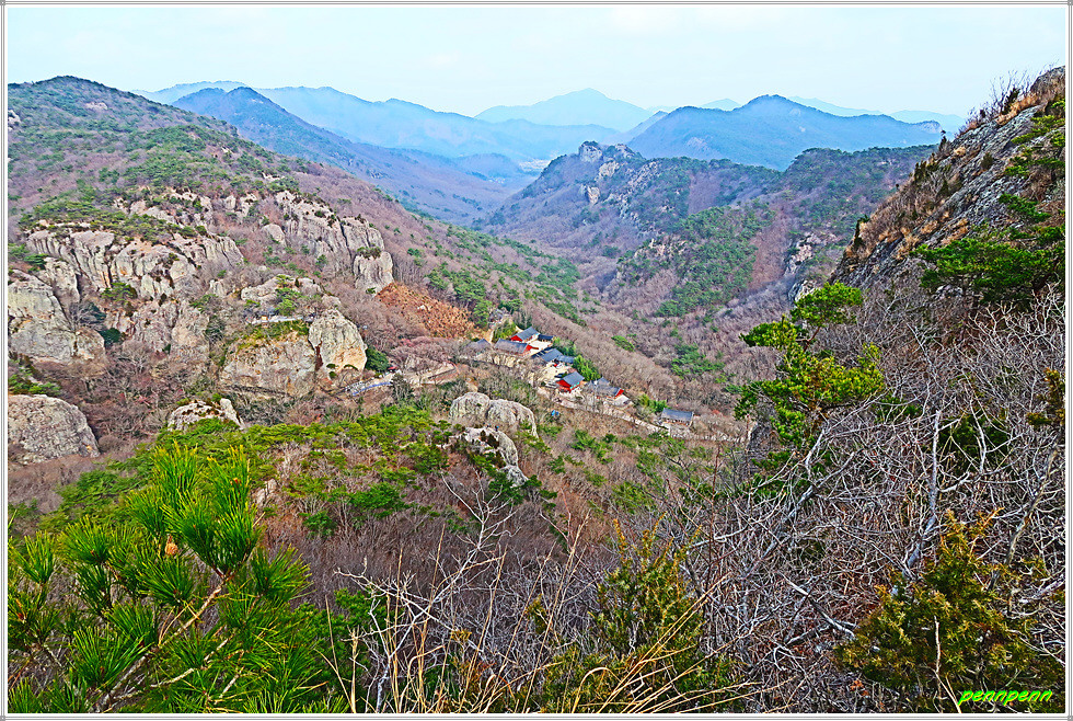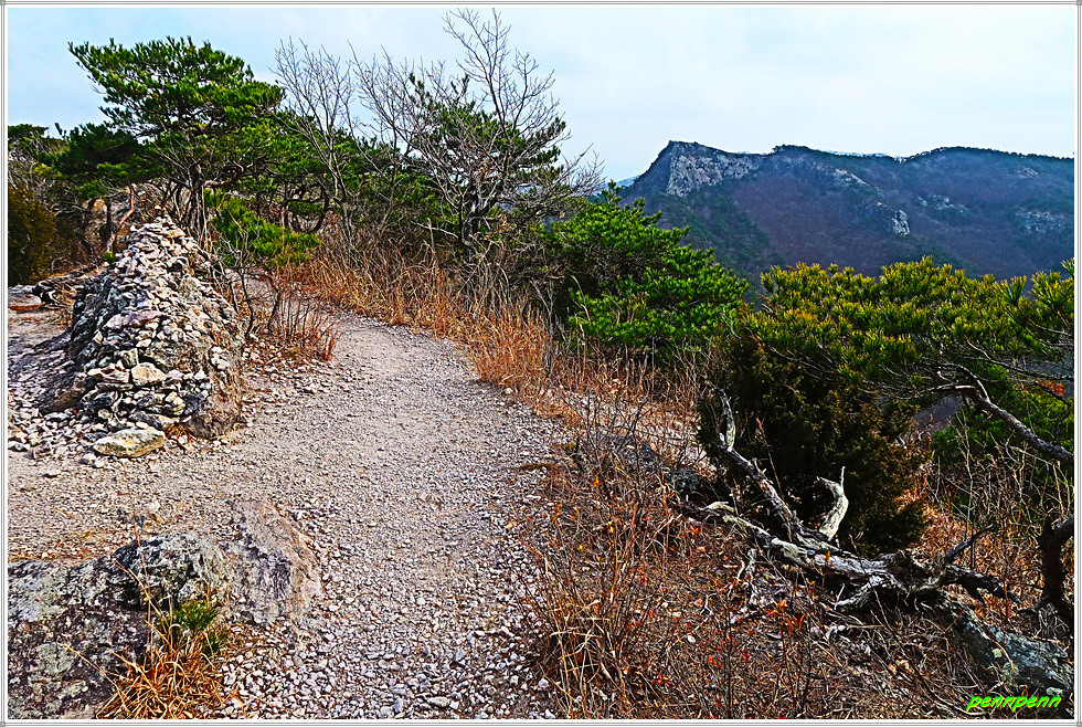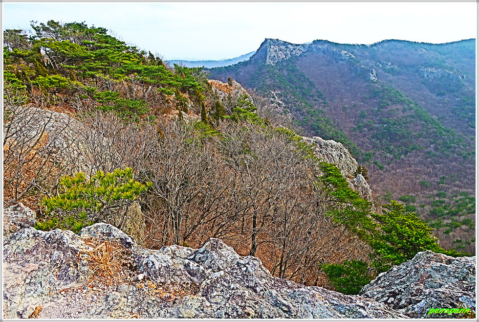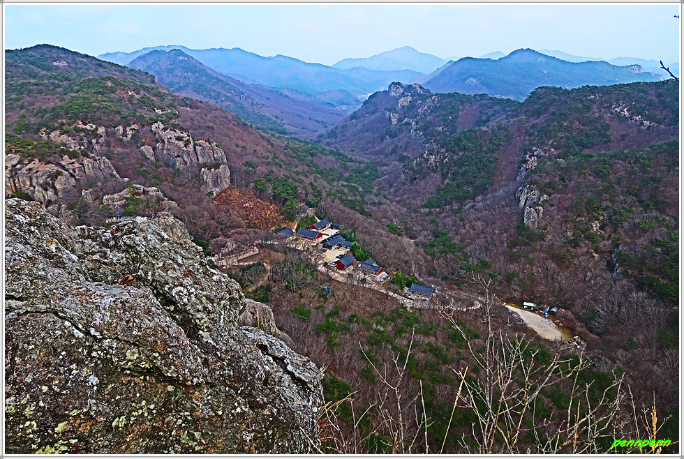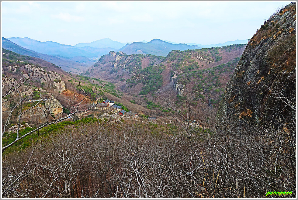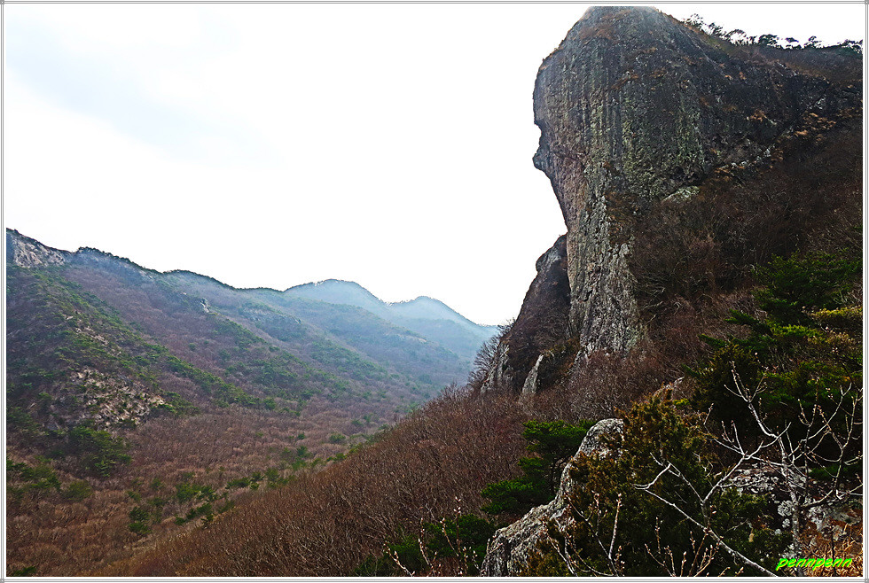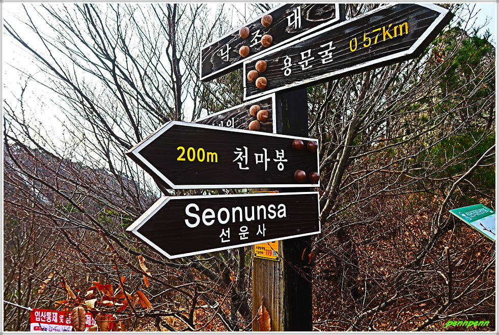 천마봉에서 하산하는 방법은 두 가지입니다. 쉬운 길은 낙조대와 용문굴을 거쳐 도솔암으로 가는 방법입니다. 그런데 보통 사람들은 동일한 길을 걷는 새로운 길을 선택하는 경향이 있는데 바로 낙조대로 되돌아오면서 우측의 급경사 계단을 이용하는 방법입니다. 이 길의 장점은 중간 안부에서 말이 하늘을 향해 뛰어 오르는 것과 같은 천마봉의 모습을 가까이에서 직관할 수 있다는 것입니다. 또 맞은편 암벽의 도솔암 마애불과 도솔천 내원궁을 더욱 산명하게 볼 수 있습니다.