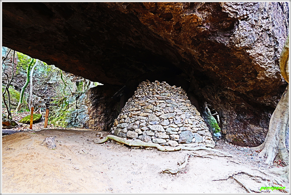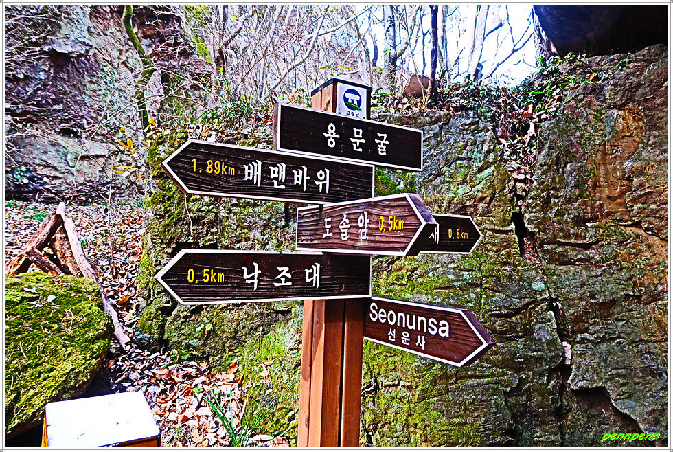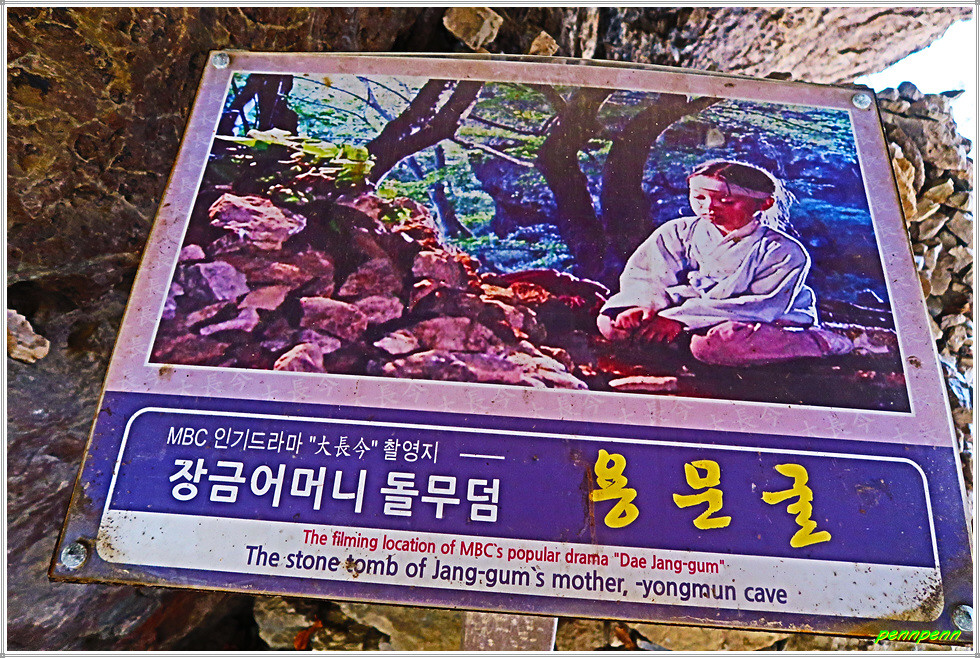 진흥굴을 나와 진흥골을 더 들어가면서 도솔암과 마애불을 경유해 서쪽의 골짜기를 따라 오르면 용문굴입니다. 마애불에서 용문굴까지의 거리는 450m입니다. 낙조대 아래에 자리 잡은 용문굴은 선운사 창건설화에 등장하는 굴로 예전부터 전해져 내려오는 이야기가 있습니다. 백제 위덕왕 24년(577) 검단선사가 절을 세울 목적으로 선운산을 찾았는데, 와서 보니 선운사 자리의 연못에 이미 용이 한 마리 살고 있어 검단선사는 그 용을 쫓아냈고 용은 급히 도망치다가 바위에 부딪히며 굴을 만들었는데 그것이 바로 용문굴이라는 것입니다. 이곳은 대장금 촬영지로 장금의 어머니 돌무덤이 있던 곳입니다.