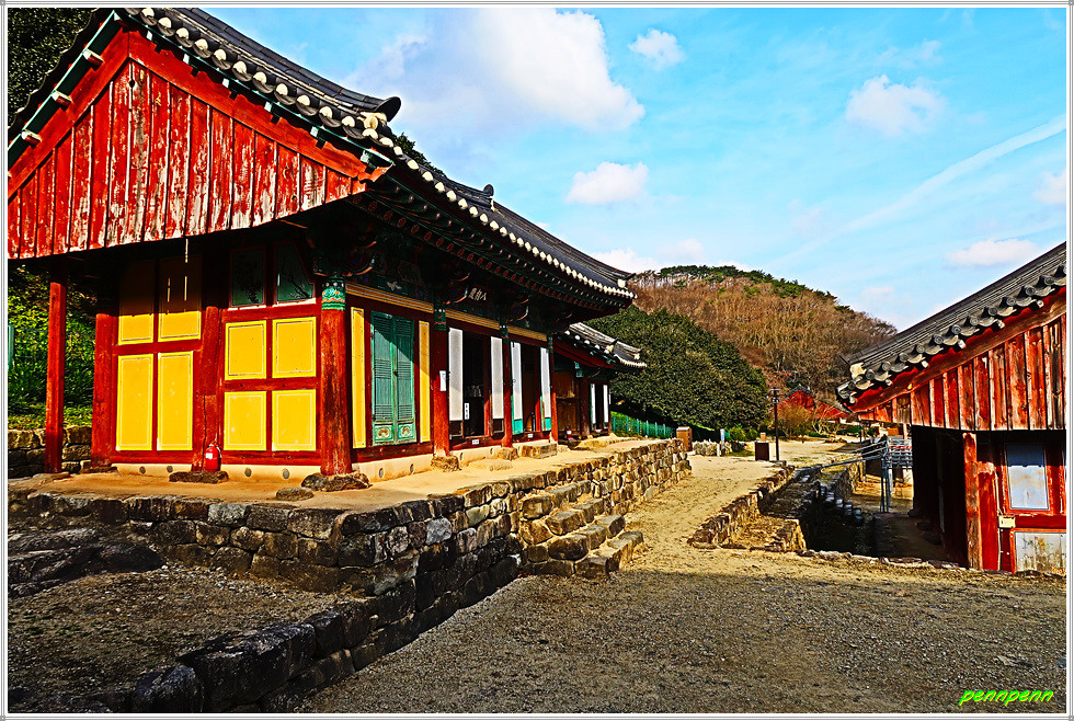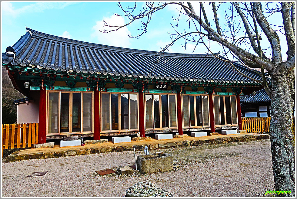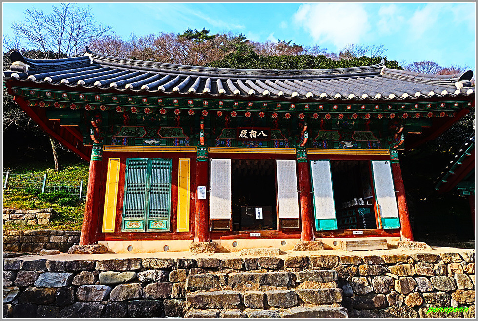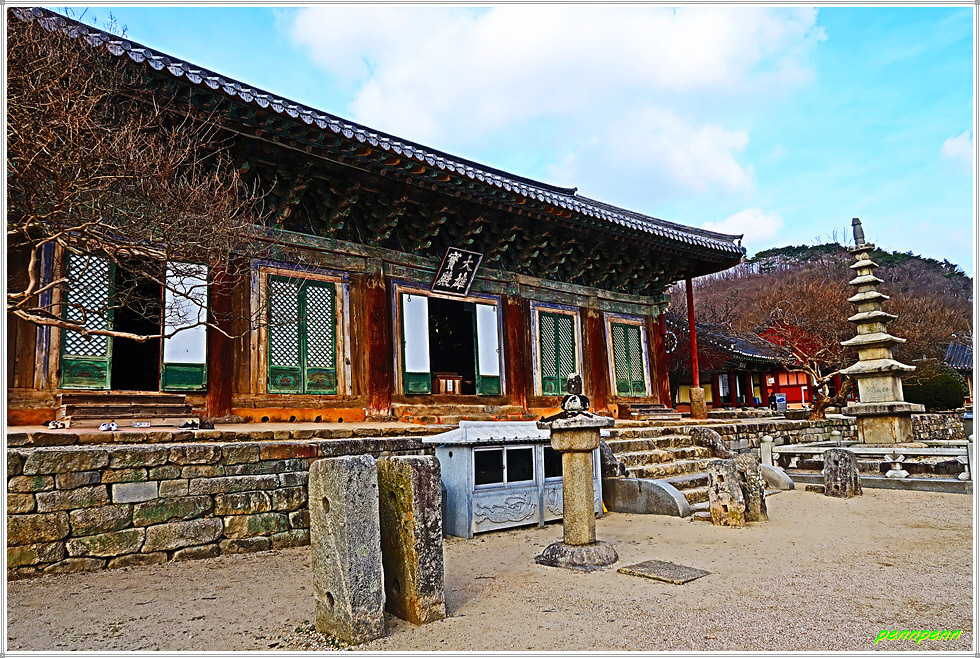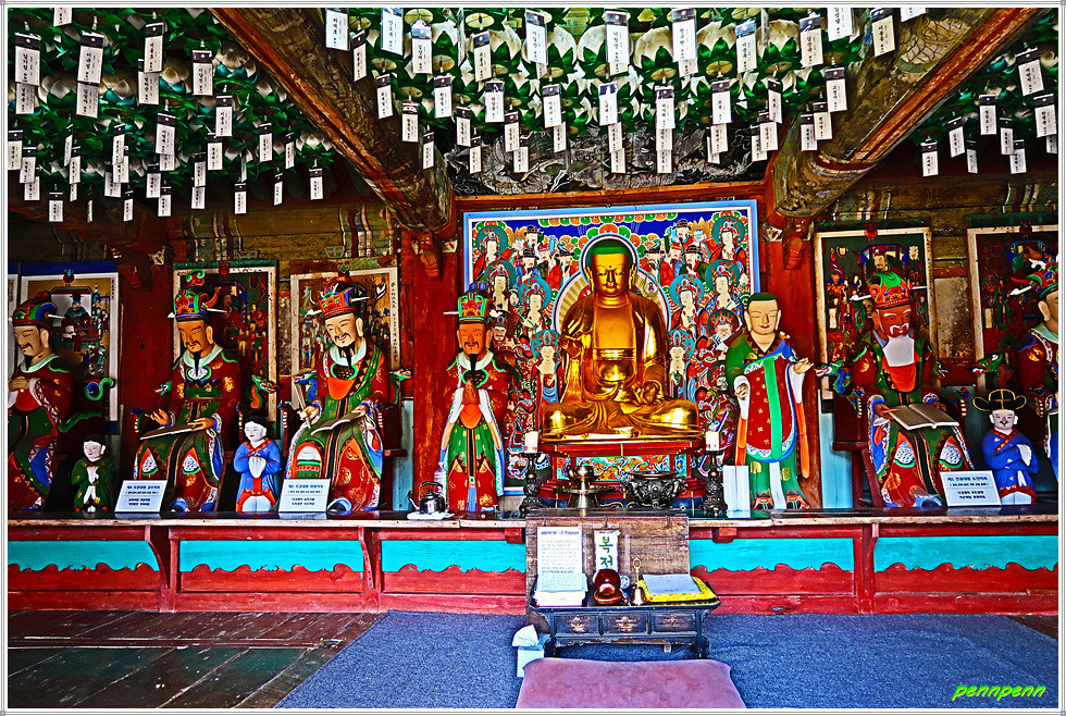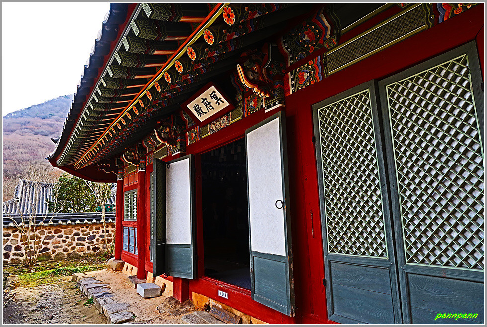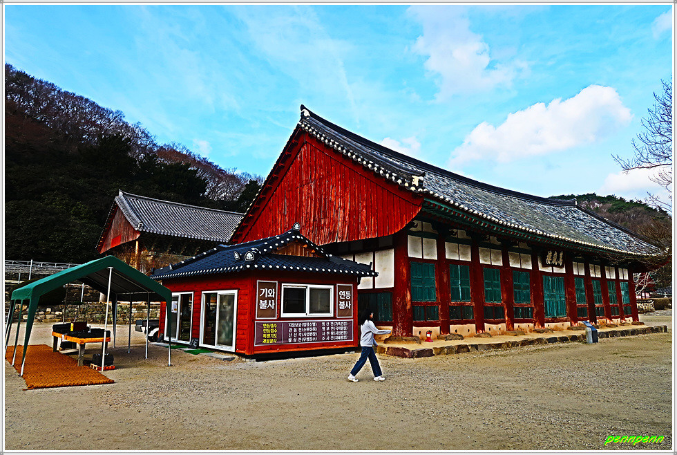 영산전 아래 명부전(冥府殿)은 저승의 유명계(幽冥界)를 나타낸 전각으로, 원래는 지장보살을 봉안한 지장전과 시왕(十王)을 봉안한 시왕전이 별도로 있었던 것을 17세기 이후에 두 전각을 결합했습니다. 정면 5칸 측면 3칸 규모의 맞배지붕 건물로 전면의 중앙 3칸에는 분합문을 설치하였습니다. 명부전 옆에는 감로수가 있어 목을 축이기에 안성맞춤입니다.