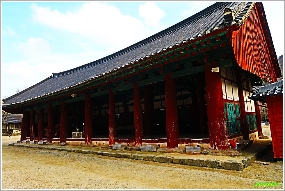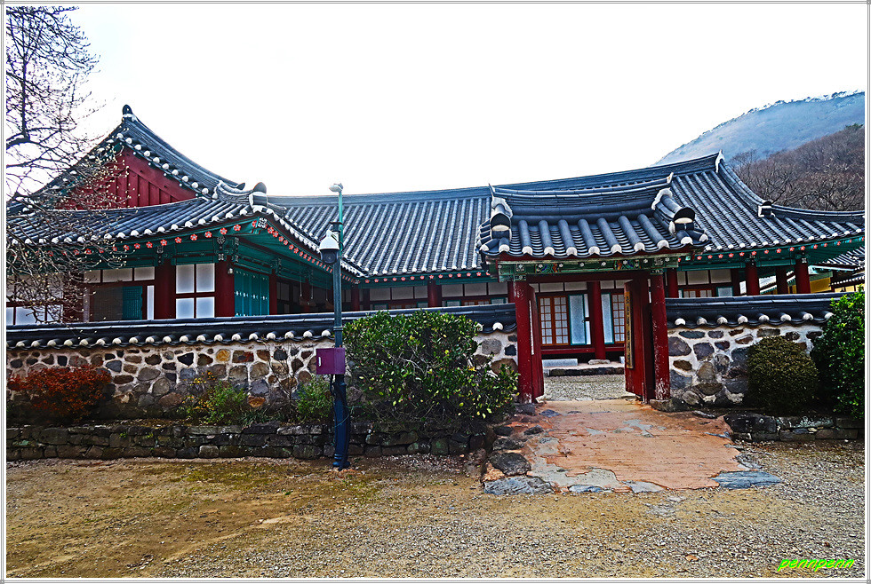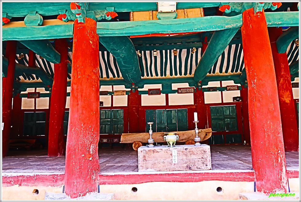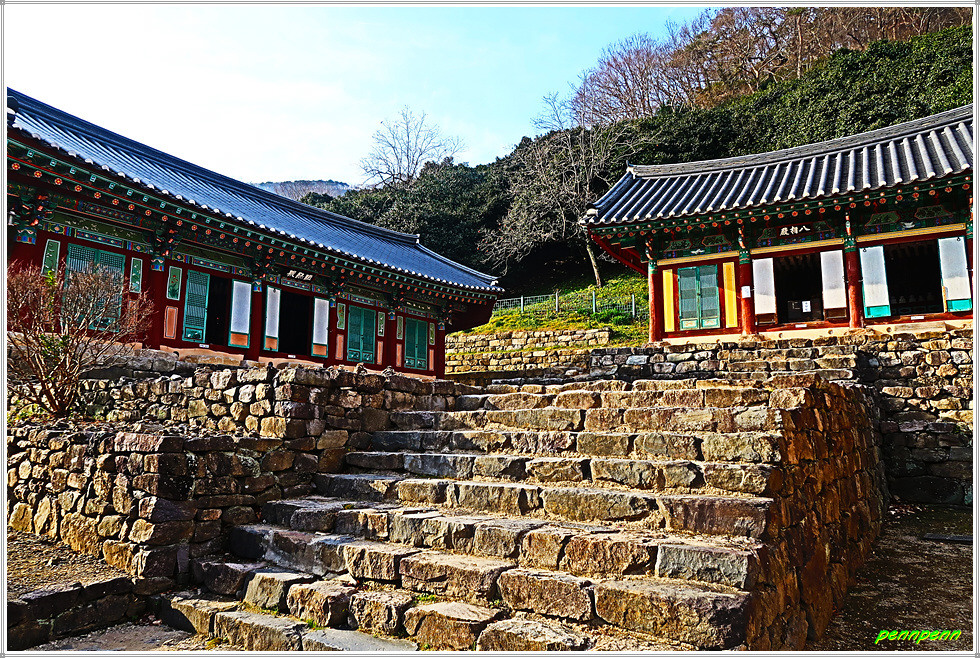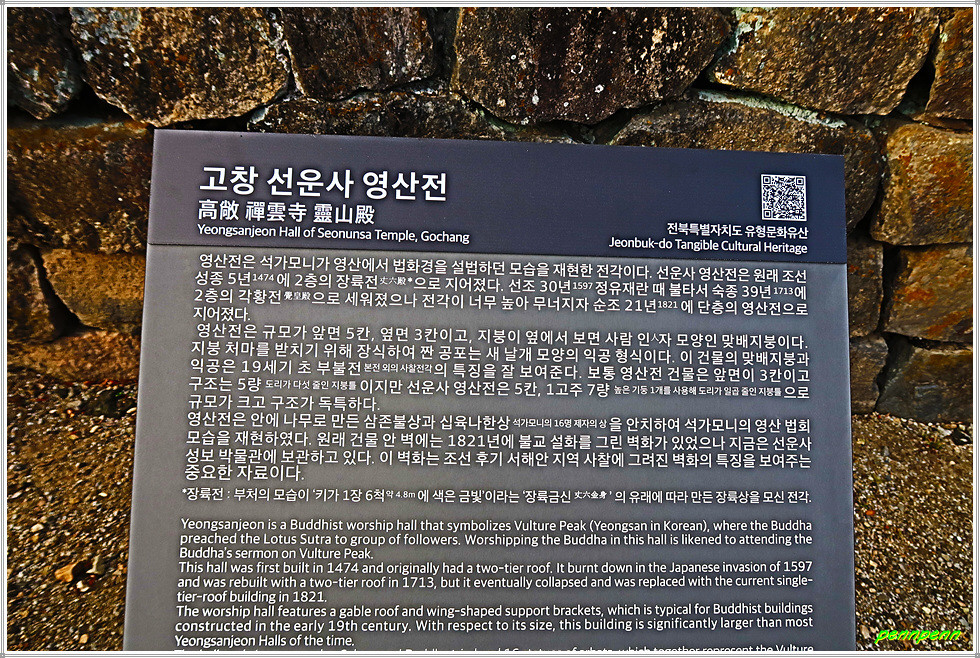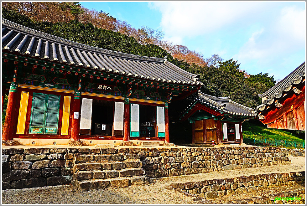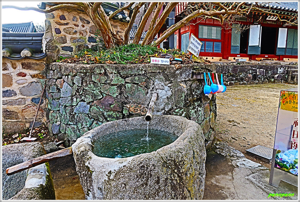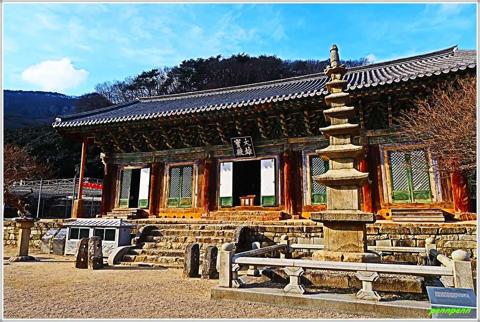 영산전 아래 명부전(冥府殿)은 저승의 유명계(幽冥界)를 나타낸 전각으로, 원래는 지장보살을 봉안한 지장전과 시왕(十王)을 봉안한 시왕전이 별도로 있었던 것을 17세기 이후에 두 전각을 결합했습니다. 정면 5칸 측면 3칸 규모의 맞배지붕 건물로 전면의 중앙 3칸에는 분합문을 설치하였습니다. 명부전 옆에는 감로수가 있어 목을 축이기에 안성맞춤입니다.