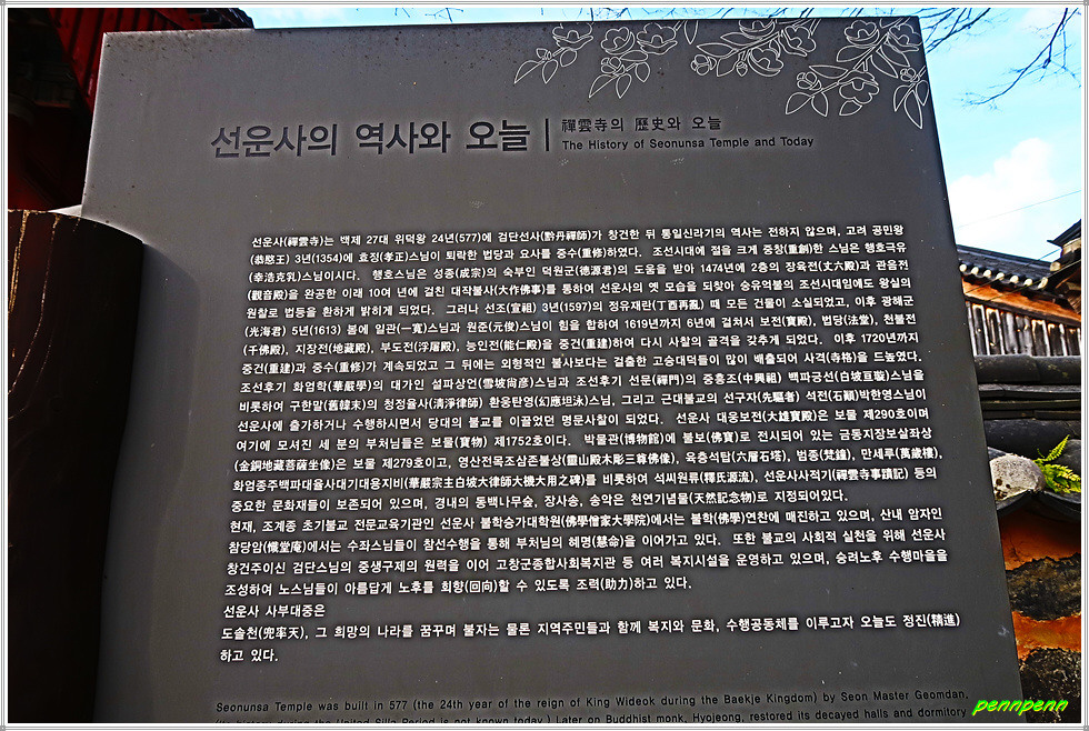 전북 고창군 아산면 삼인리 소재 선운사(禪雲寺)는 대한불교 조계종 24교구 본사로 김제의 금산사와 함께 전라북도의 2대 사찰이며 고창지역의 대표적인 절입니다. 선운사는 신라의 진흥왕이 꿈을 꾸고 감동하여 절을 세웠다는 설, 557년에 백제의 고승 검단이 창건했다는 설이 있는데 가장 오래된 조선 후기의 사료들에는 진흥왕이 창건하고 검단선사가 중건한 것으로 기록되어 있으며, 대웅전을 비롯해 4점의 보물을 간직하고 있습니다. 선운사 홈페이지와 현지 안내문은 검단선사 창건설을 따르고 있군요.