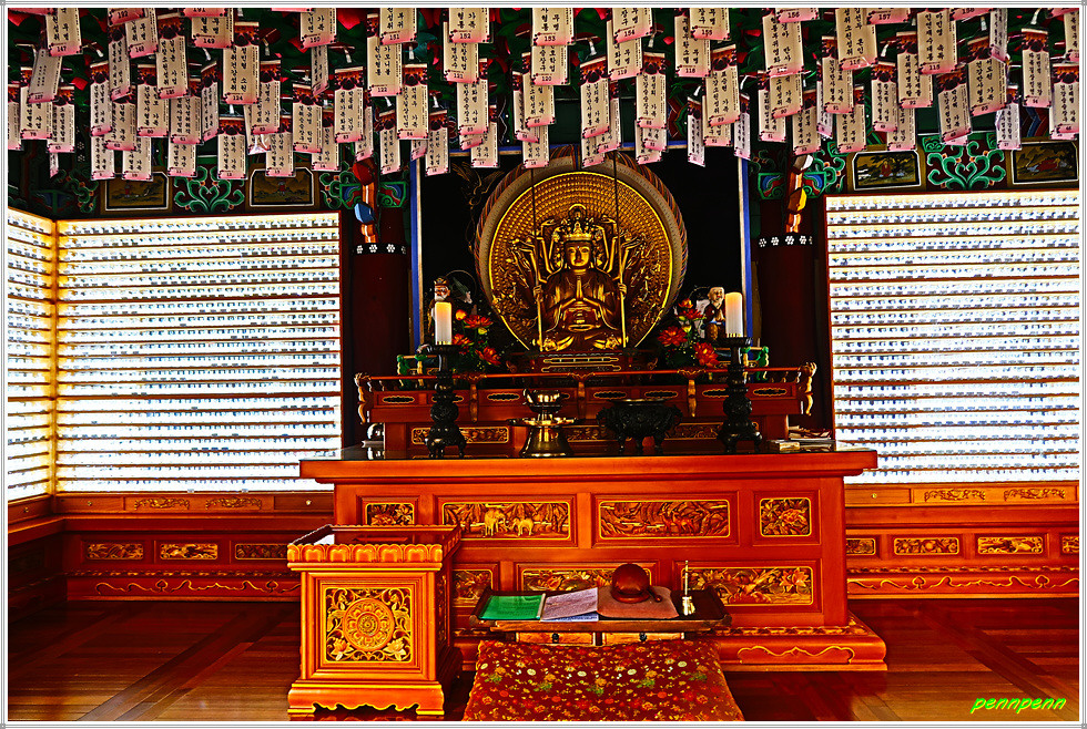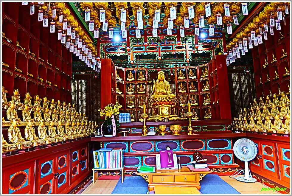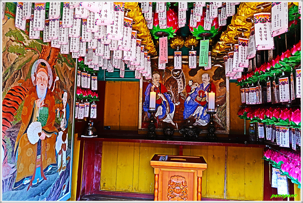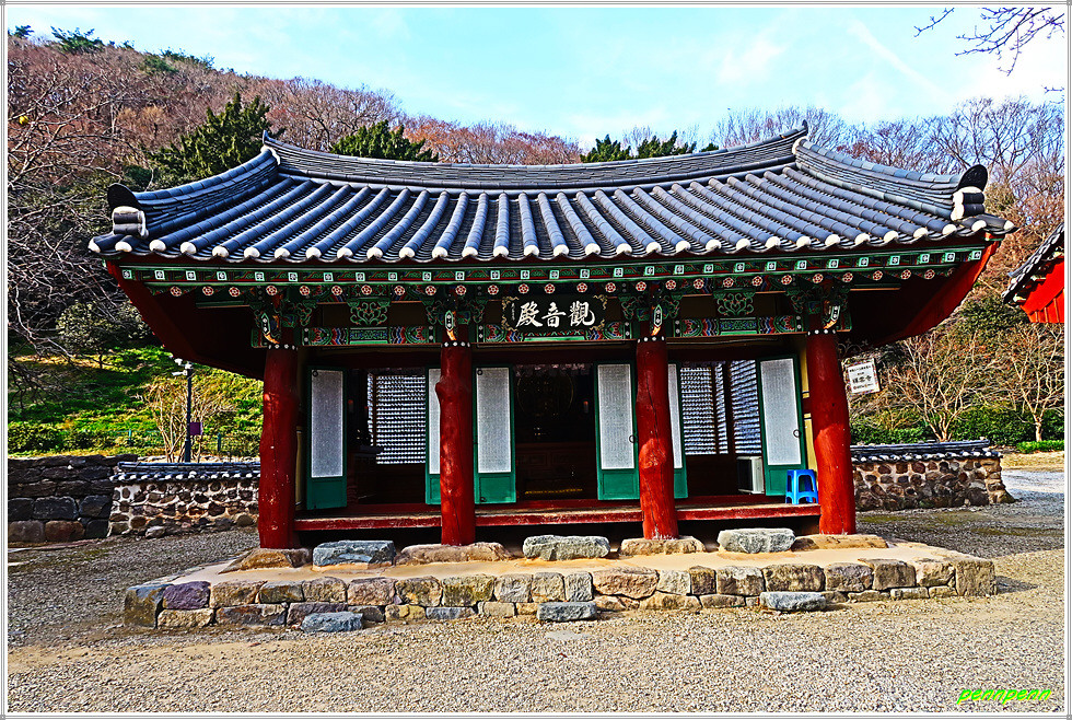 대웅보전 우측 관음전(觀音殿)은 관세음보살을 주불로 모신 사찰의 전각으로 정면과 측면 각각 3칸의 맞배지붕 건물입니다. 이곳에는 최근에 조성한 천수천안관세음보살상과 천수천안관세음 탱화, 그리고 오른쪽 벽에는 1991년에 조성한 신중탱화가 있습니다.