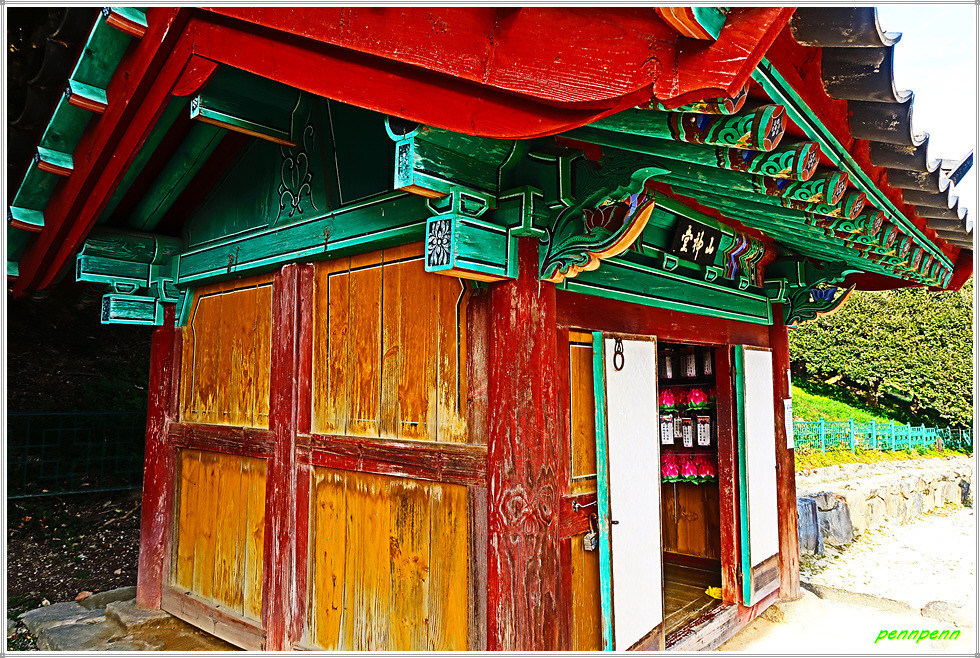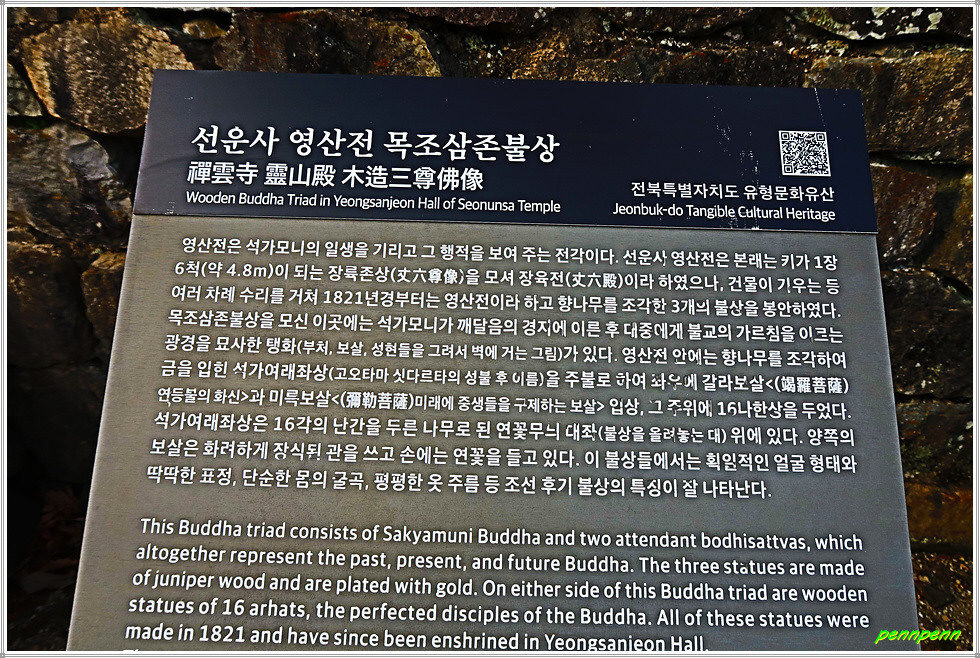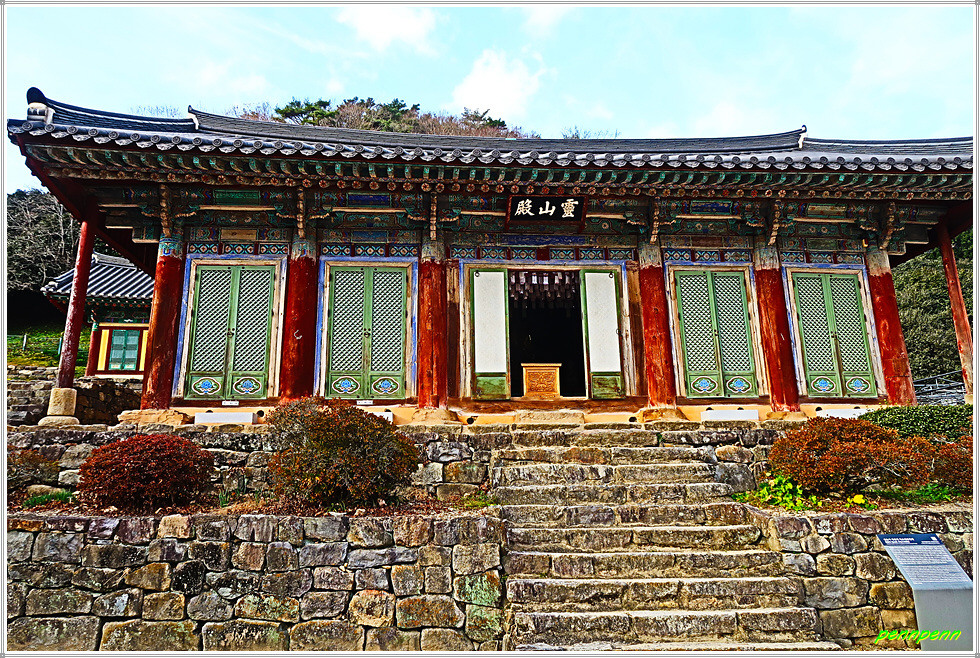 대웅보전 좌측의 영산전(靈山殿)은 사찰에서 석가모니의 일생을 기리고 그 행적을 보여주는 전각입니다. 정면 5칸, 측면 3칸의 맞배지붕 건물로 2단의 높은 축대 위에 조성된 영산전의 원래 이름은 장육전(丈六殿)이었다고 합니다. 영산전에는 향나무로 조각해 금을 입힌 목조삼존불상이 있는데 석가여래좌상을 중심으로 갈라보살과 미륵보살을 모셨습니다.