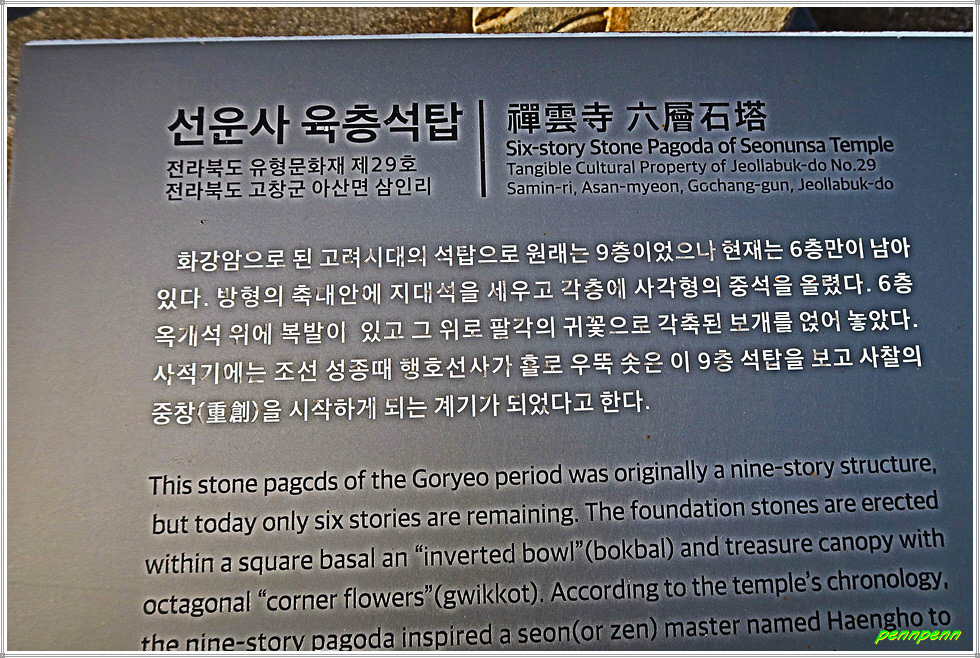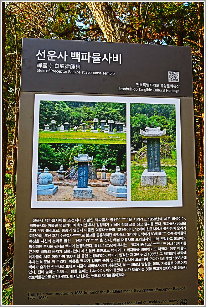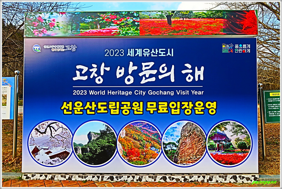 일주문 앞에는 2023년 고창방문의 해를 맞아 선운산 도립공원을 무료로 개방한다는 안내문이 보입니다. 안으로 들어서면 우측 선운사 부도전이 있는 곳에 백파율사비가 있습니다. 백파율사는 조선 후기의 승려 긍선(1767~1852)의 법호이며, 화엄종 계통의 승려로 조선왕조의 억불정책에도 불구하고 조선후기 불교의 참신한 종풍을 일으킨 화엄종주입니다. 이 비석은 백파율사의 업적을 기리기 위해 철종 9년(1858)에 건립된 비석으로 비문은 조선시대 명필 추사 김정희의 필적으로 쓰였으며, 비문 내용은 백파의 업적과 인품을 기리며 찬양하는 내용으로 추사체의 연구와 율사의 업적을 연구할 수 있는 귀중한 자료입니다.