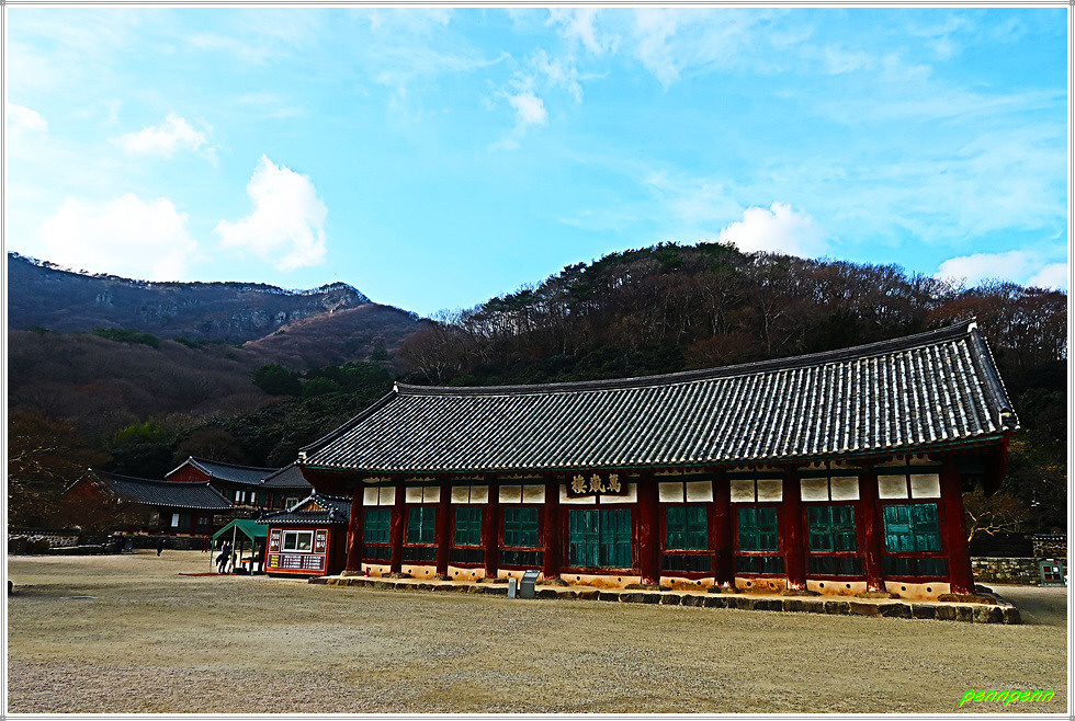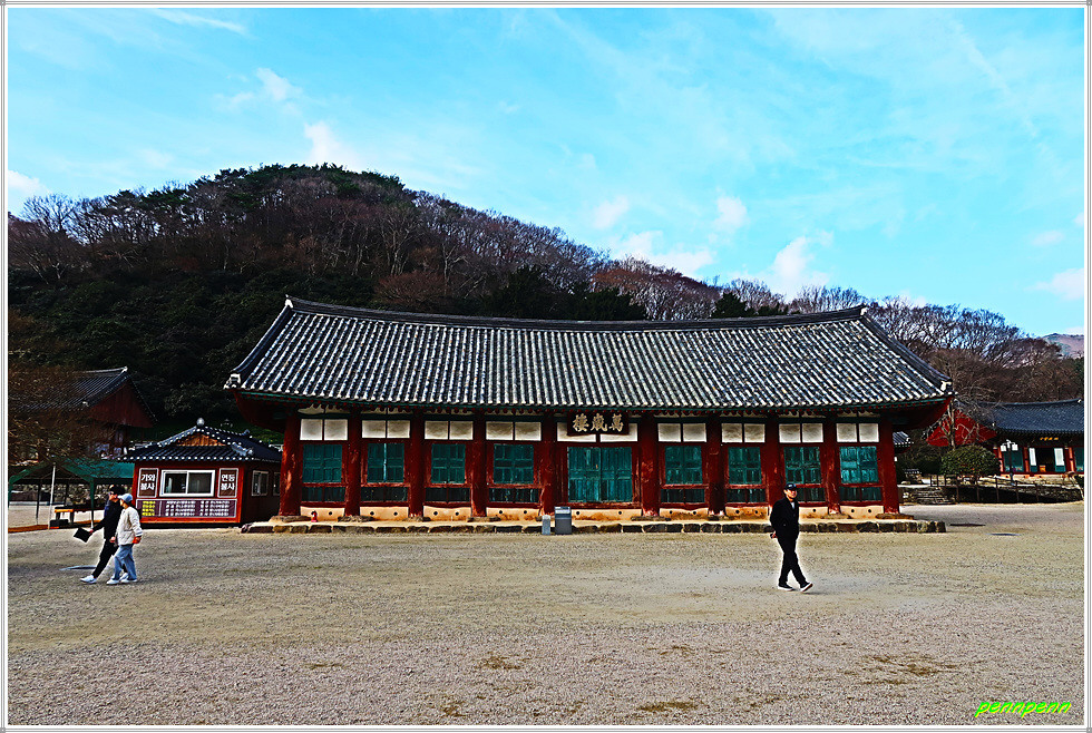 안으로 들어서면 중앙에 만세루가 있는데요. 만세루는 대웅보전을 마주하고 있는 누각으로 예불과 설법 및 법회를 하는 전각입니다. 조선후기에 지어진 것으로 보물(제2065호)로 지정된 문화재이며, 건축규모는 정면 9칸, 측면 2칸의 맞배지붕건물입니다.