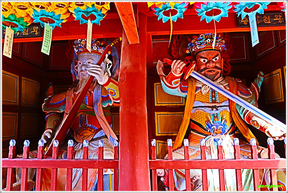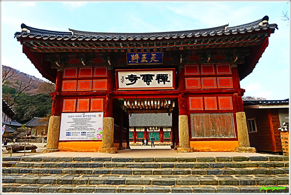 천왕문(사천왕문)에는 선운사 현판이 걸려 있는데, 이는 사찰로 들어서는 3문(三門) 중 일주문 다음에 위치하는 대문을 지칭하는 용어입니다. 이곳은 불법을 수호하는 사천왕을 모시는 곳으로 문 안에는 그림 또는 조상(彫像)한 사천왕을 봉안하고 있습니다.