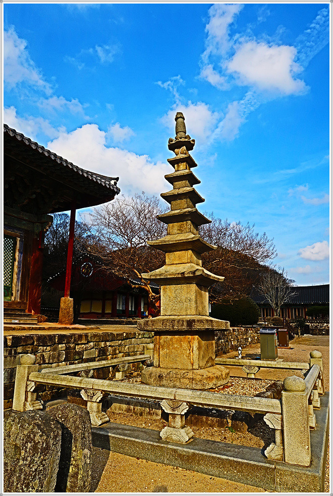 대웅보전 앞에는 육층석탑이 있는데, 화강암으로 만든 고려시대의 석탑으로 원래는 9층이었으나 현재 6층만이 남아 있습니다. 사적기에는 조선 성종 때 행호선사가 홀로 우뚝 솟은 이 9층 석탑으로 보고 사찰의 중창을 시작하는 계기가 되었다고 전합니다.