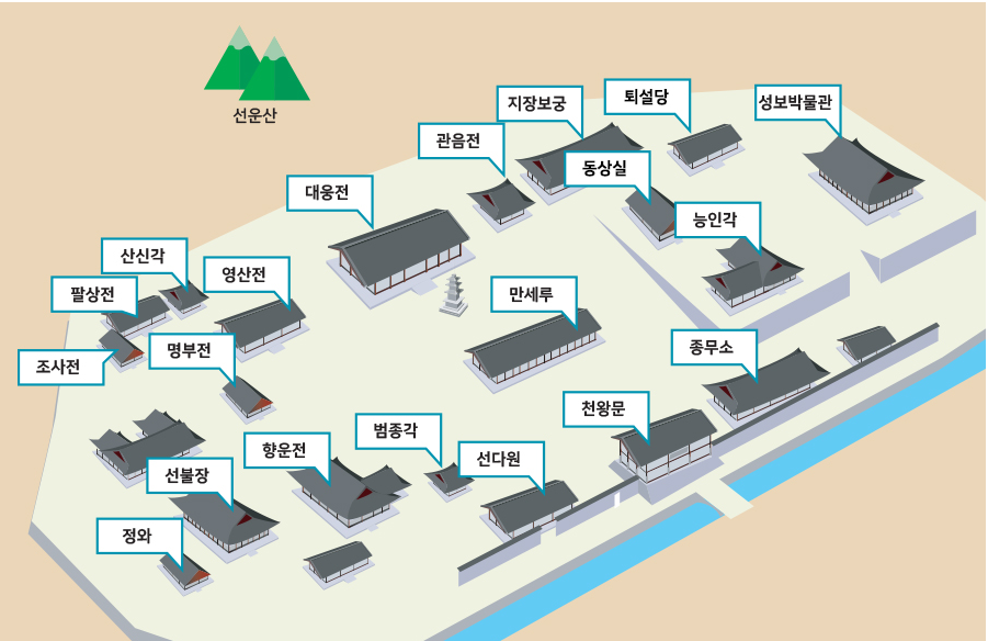 사찰의 동쪽에는 동상실, 능인각, 성보박물관이 있고, 사찰의 서쪽에는 향운전과 선불장이 있으며, 천왕문 옆에는 종무소가 있습니다. 선운사의 산내암자로는 도솔암, 참당암, 석상암, 동운암이 있고, 말사로는 부안 내소사, 정읍 내장사, 부안 개암사, 고창 문수사를 포함해 모두 60곳의 말사를 거느린 대찰입니다.