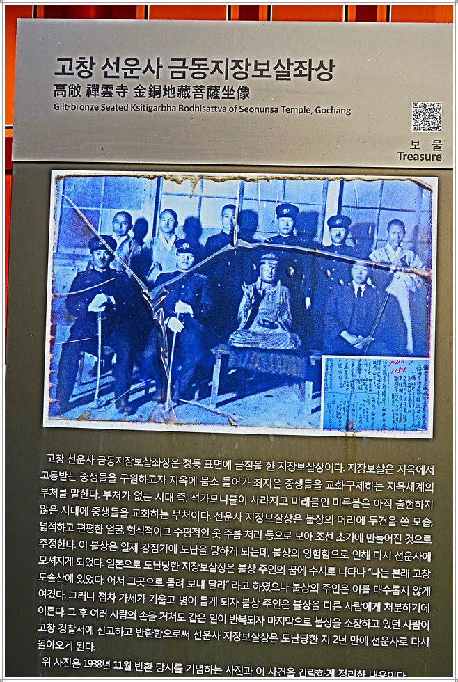 이곳에는 일본으로 반출당했던 불상이 그 영험으로 우리나라도 돌아오게 된 사연을 소개한 안내문이 있어 이를 옮겨 적습니다. 이 지장보살상은 일제강점기인 1936년 여름에 도단을 당해 일본으로 건너가게 되었는데 지장보살상이 소장하는 사람 꿈에 나타나서 "나는 본래 전라도 고창 도솔산에 있었다. 어서 그곳으로 돌려보내 달라."고 하였답니다. 그리고 소장하는 사람의 집안에 우환이 끊이질 않게 되었고, 여러 사람의 손을 거치면서 이 보살상을 소장한 사람들이 겪은 일들이 널리 알려지게 되었으며 마지막으로 소장하게 된 사람이 고창 경찰서에 모셔갈 것을 부탁하기에 이르렀다고 합니다. 도난당한 지 2년여 만인 1938년 11월 선운사 스님들과 경찰들이 일본 히로시마로 가서 모셔오게 되었다고 합니다.