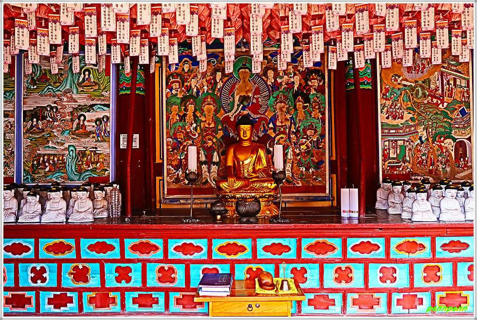 대웅전은 석가모니불을 모신 사찰의 중심 건물로 보통 석가모니불을 중심으로 좌우에 문수보살과 보현보살을 모십니다. 대웅보전(大雄寶殿)은 대웅전의 격을 높여 부르는 말입니다. 선운사 대웅보전(보물 제290호) 내 신중도는 1807년(순조 7년)에 수화승(首畵僧) 오봉(鰲峰) 등에 의해 제작된 불화로 화면 구성이 빼어나고 원만한 상호 및 인체 비례의 적정 등 인물 표현이 자연스럽고 색채 표현이 조화로운 수작(秀作)으로 평가된다고 합니다. 그런데 석가모니불 뒤편의 불화를 의미하는지는 잘 모르겠습니다.