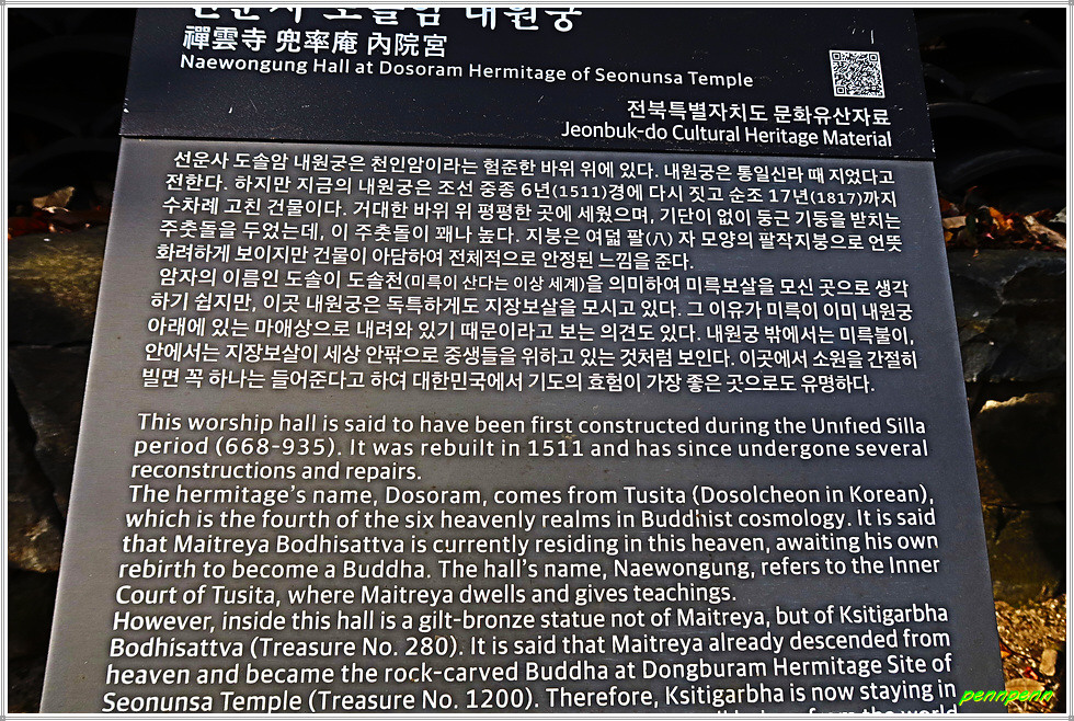 나한전 우측에는 도솔천내원궁 현판이 붙은 일주문이 있는데 일주문 현판은 도솔천내원궁이지만 안내문은 도솔암내원궁입니다. 그런데 도솔천(兜率天)도 개천을 뜻하는 내천(川)자가 아니라 하늘을 뜻하는 하늘천(天)자입니다. 따라서 도솔천((兜率天)은 “미륵이 산다는 이상세계”를 말한다고 하는군요. 내원궁이 있는 암자터 바위이름을 천인암이라고 하는데 이는 사찰의 암자가 아니라 바위 이름임을 잘 기억해야 할 것입니다.