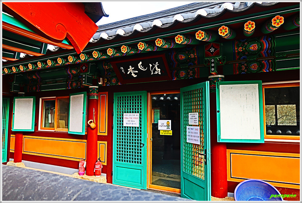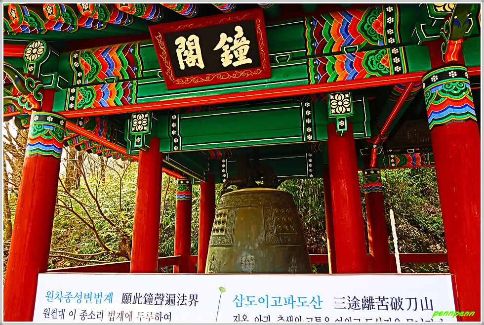 찻집 뒤에는 보제루(普濟樓)가 있는데 이는 사찰의 중심 불전 앞에 세워지는 누각을 지칭하는 용어로 절에 따라 만세루(萬歲樓) 또는 구광루(九光樓)라고도 하며, “두루 모든 중생을 제도한다”는 뜻에서 보제루라는 명칭을 많이 사용하고 있습니다. 보제루 앞에는 초서체의 현판이 달린 전각이 있는데 글씨를 읽을 수가 없을 지경입니다. 혹시 만심당(滿心堂)이 아닌지 잘 모르겠습니다. 주차장과 종무소를 뒤로하면 좌측에 종각이 있는데 주말에는 방문객들이 자유롭게 종을 타종할 수 있음이 매우 이채롭습니다.