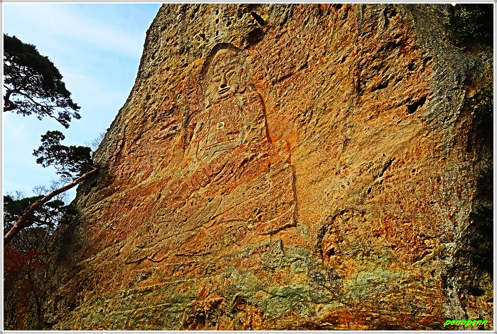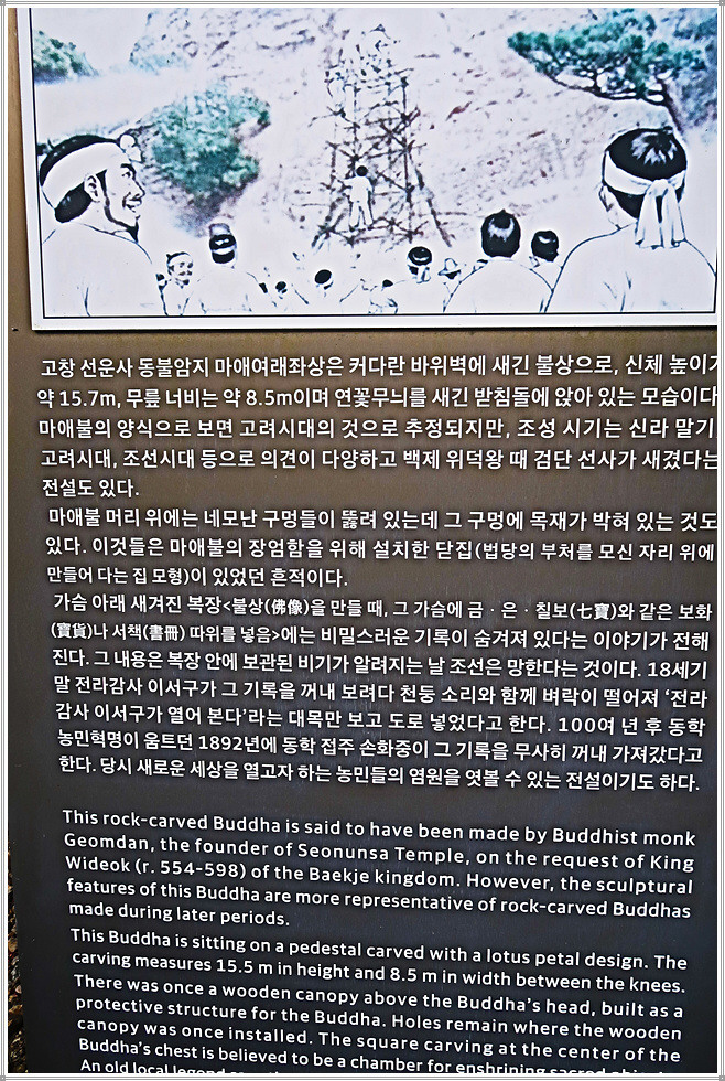 내원궁을 내려와 나한전 옆 윤장대를 지나면 바로 유명한 마애불입니다. 정식명칭은 <선운사 동불암지 마애여래좌상>(보물 제1200호)이지만 보통 "도솔암 마애불"이라고도 부릅니다. 고려시대에 조각한 것으로 보이는 이 불상은 한국에서는 가장 큰 마애불상 중의 하나로 미륵불로 추정됩니다. 지상 3.3m의 높이에서 책상다리를 하고 앉아 있는 불상의 높이는 15.6m, 폭이 8.48m가 되며, 연꽃무늬를 새긴 계단모양의 받침돌까지 갖추고 있습니다. 머리 위의 구멍은 동불암이라는 누각의 기둥을 세웠던 곳입니다.