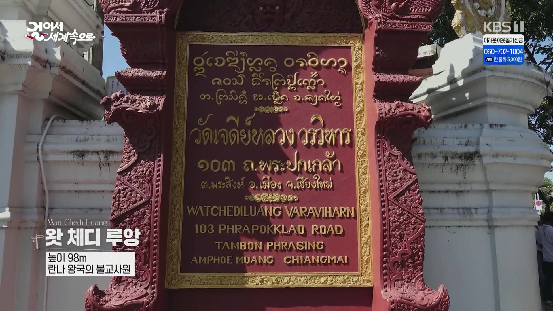 KBS 1TV에서 방영중인 “걸어서 세계 속으로”는 세계의 다양한 도시들을 여행자의 시각으로 바라보고 그들의 역사와 문화, 삶의 모습을 담은 프로그램입니다. 지난 2023. 12. 23 방영된 제822회의 주제는 “북방의 장미, 란나왕국을 찾아서 태국”이였습니다.