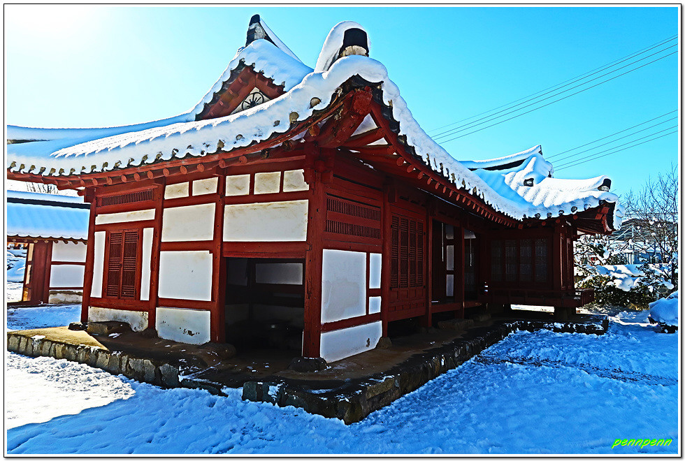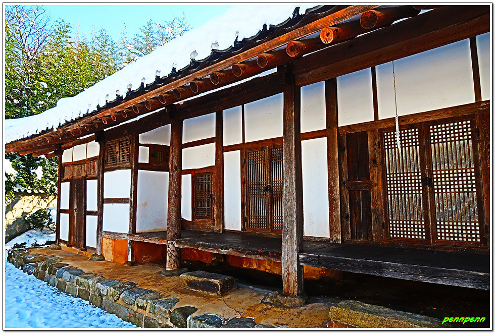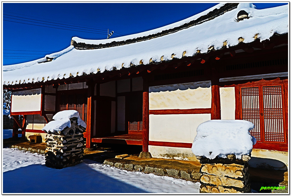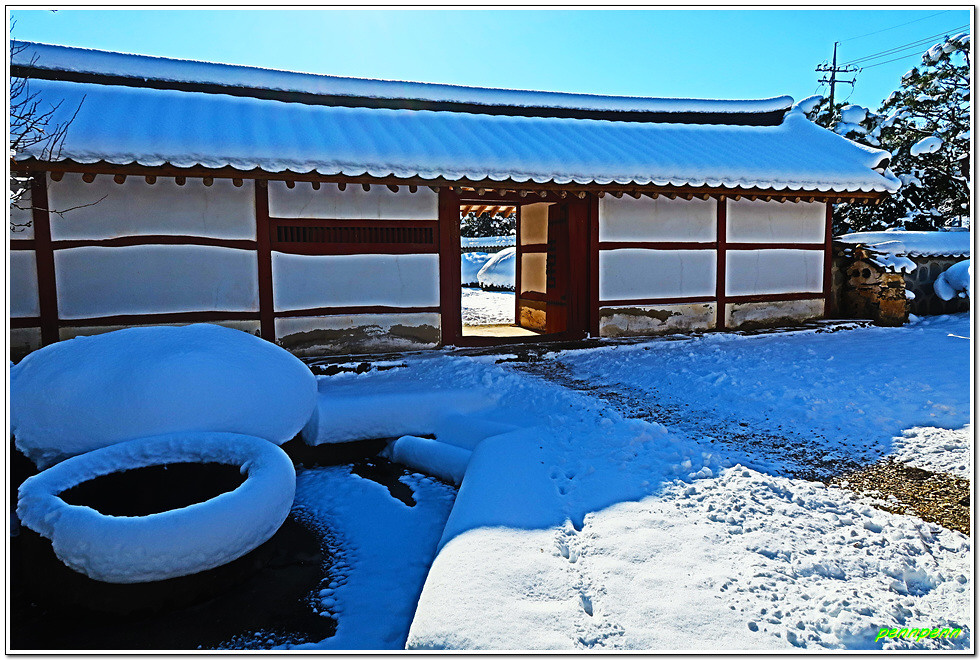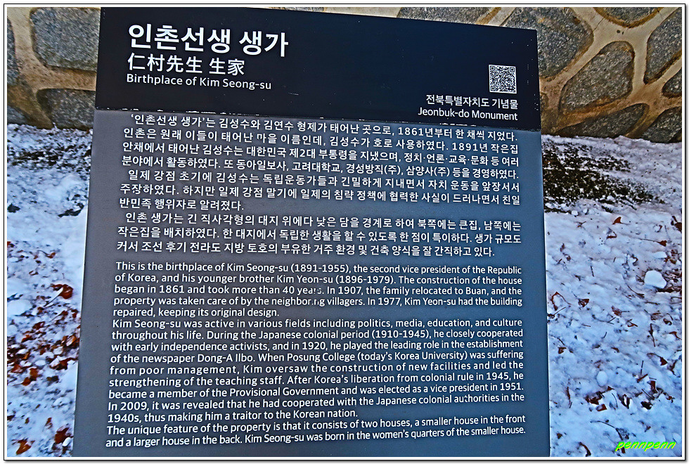 인촌과 수당 형제 가족들은 1907년 이 고장을 휩쓴 화적떼의 행패와 도깨비불 출몰로 인해 부안군 줄포면 줄포리로 이사를 감에 따라 이 집은 마을 주민에게 위탁해 관리해 오다가 1977년 수당 선생이 자비(自費)로 건물을 복원하고 진입도로를 개설하였습니다. 이 생가는 조선후기 전라도 지방 토호의 부유한 거주환경 및 건축양식을 잘 간직하고 있다고 하는군요. 지난 며칠간 많은 눈이 내렸음에도 고택의 내부 관람 통로에는 눈이 치워져 있어 관리가 잘 되고 있음을 알게 되었습니다.