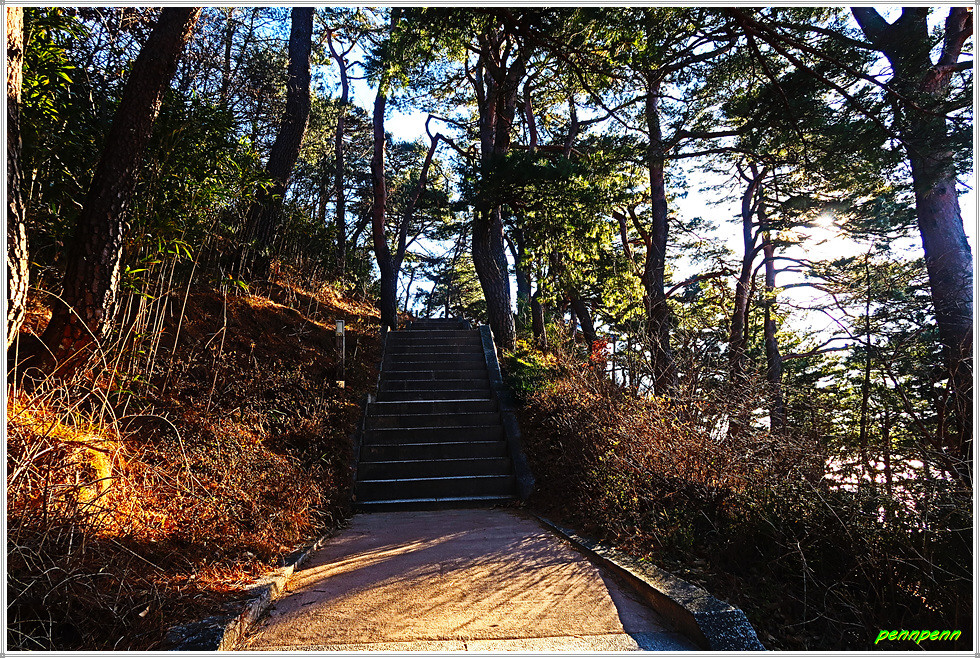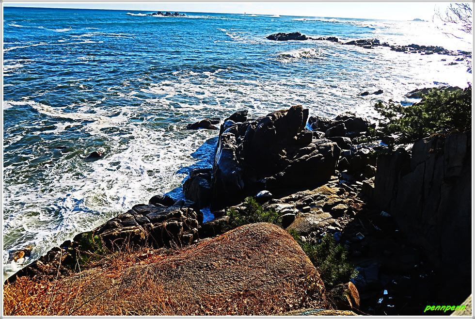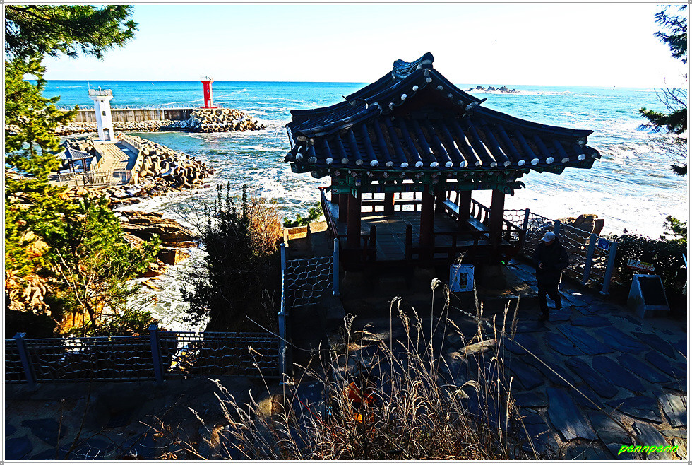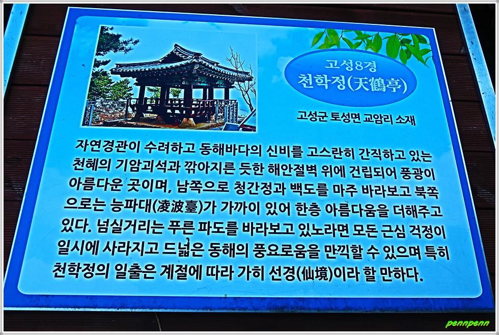 강원도 고성군 토성면 교암리 소재 천학정(天鶴亭)은 교암리 마을 앞 낮은 산의 가파른 해안 절벽 위에 자리 잡고 있는 정자로 고성8경 중 제2경입니다. 천학정은 1931년 지방유지 한치응, 최순문, 김성운 등이 뜻을 모아 정면 2칸, 측면 2칸, 겹처마 팔작지붕의 벽이 없는 단층 건물로 건립한 것입니다. 정자의 정면에는 天鶴亭(천학정)이라는 현판이 걸려 있군요. 천학정 좌측 바위에 오르면 교암항 등대와 동해의 망망대해 그리고 바닷가의 기암괴석을 볼 수 있습니다.