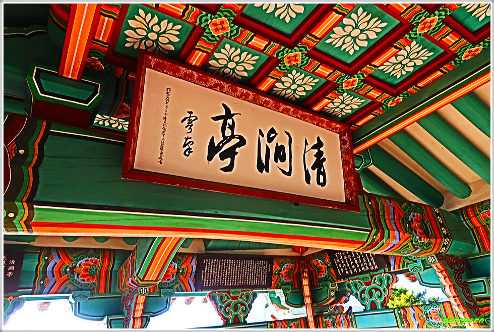자료전시관 옆에도 청간정 관련 안내문이 있습니다. 계단을 오르면 역광의 청간정이 서 있는데, 현판의 글씨는 조선의 정치가 겸 유학자인 우암 송시열(1607-1689)이 썼다고합니다. 누각으로 오르면 우남 이승만 대통령이 친필휘호로 쓴 청간정 현판을 비롯해 몇 편의 중수기와 최규하 대통령의 글씨도 걸려 있습니다.