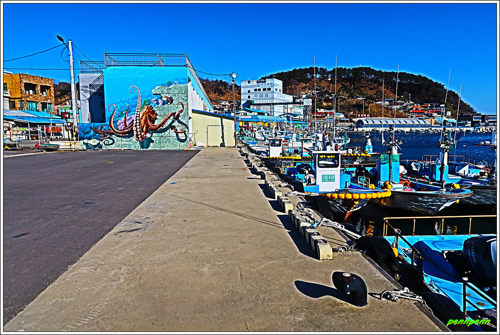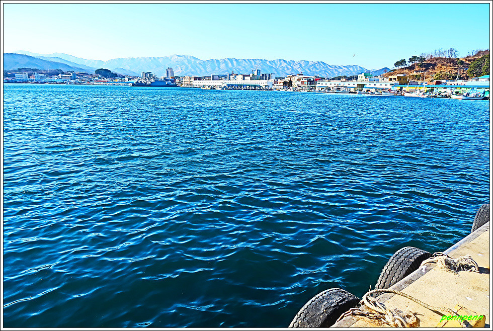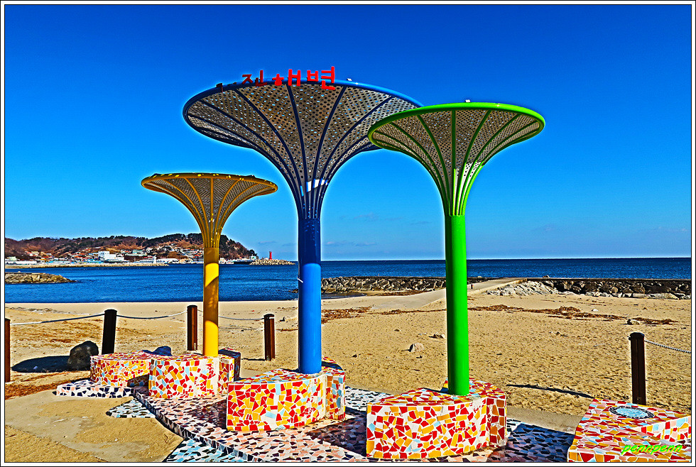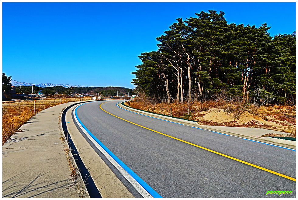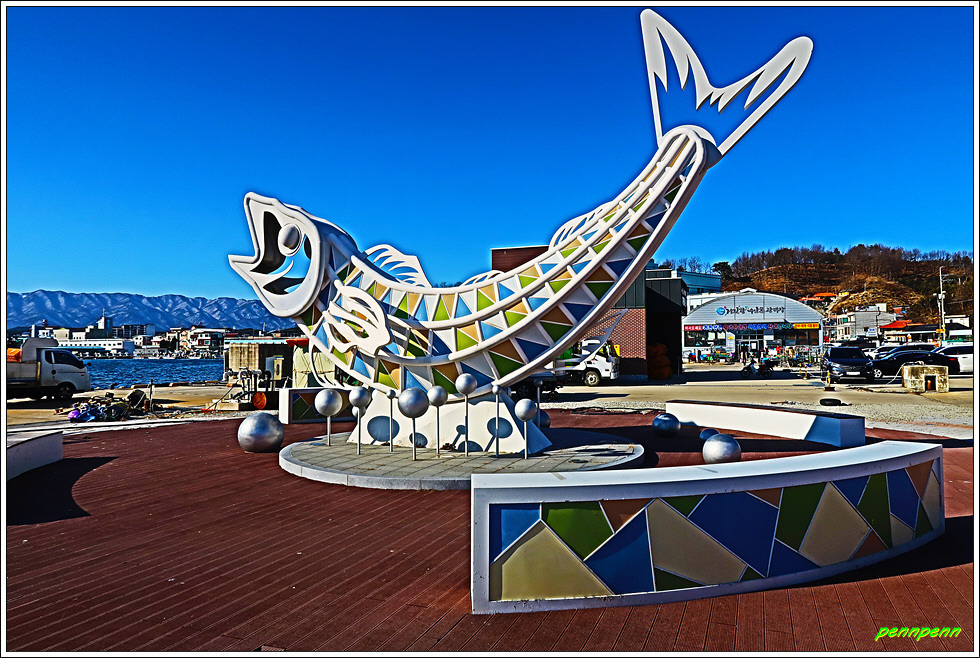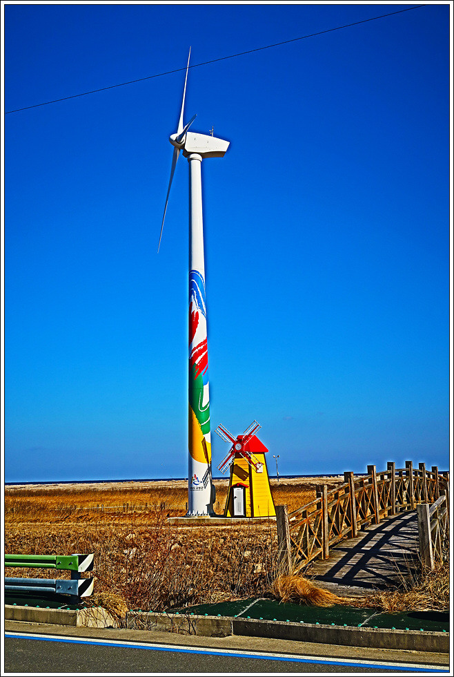 가진항을 뒤로하고 남천을 가로지르는 남천교를 건넙니다. 남천에서 서쪽을 바라보면 남쪽의 진부령에서 향로봉을 거처 북쪽 금강산에 이르는 능선이 하연 눈을 머리에 인 채 거대한 장벽처럼 서 있는 모습이 웅장합니다. 남천교를 건너 송림이 우거진 도로를 따라가노라면 풍력발전기 4기가 모습을 드러냅니다. 보통 전남 지방에서 본 풍력발전기는 단조로운데 이곳 풍력발전기는 알록달록한 색을 칠해 시각적인 아름다움을 높였고 특이 발전기 밑둥에 아담한 풍차를 설치하여 마치 예술작품 같은 모습으로 변신시켜 놓았습니다.