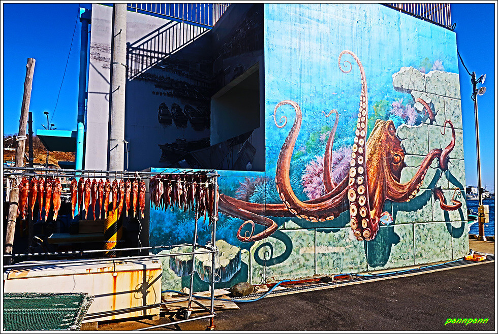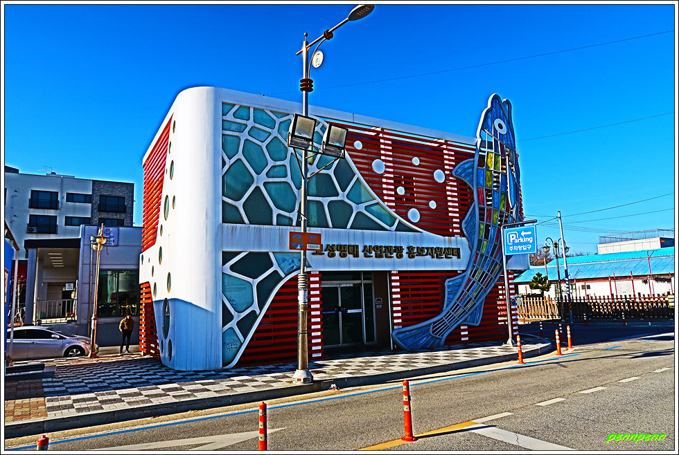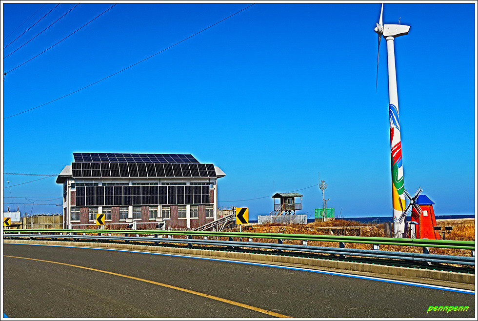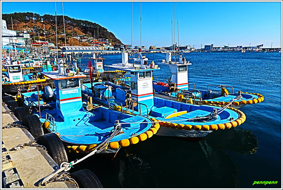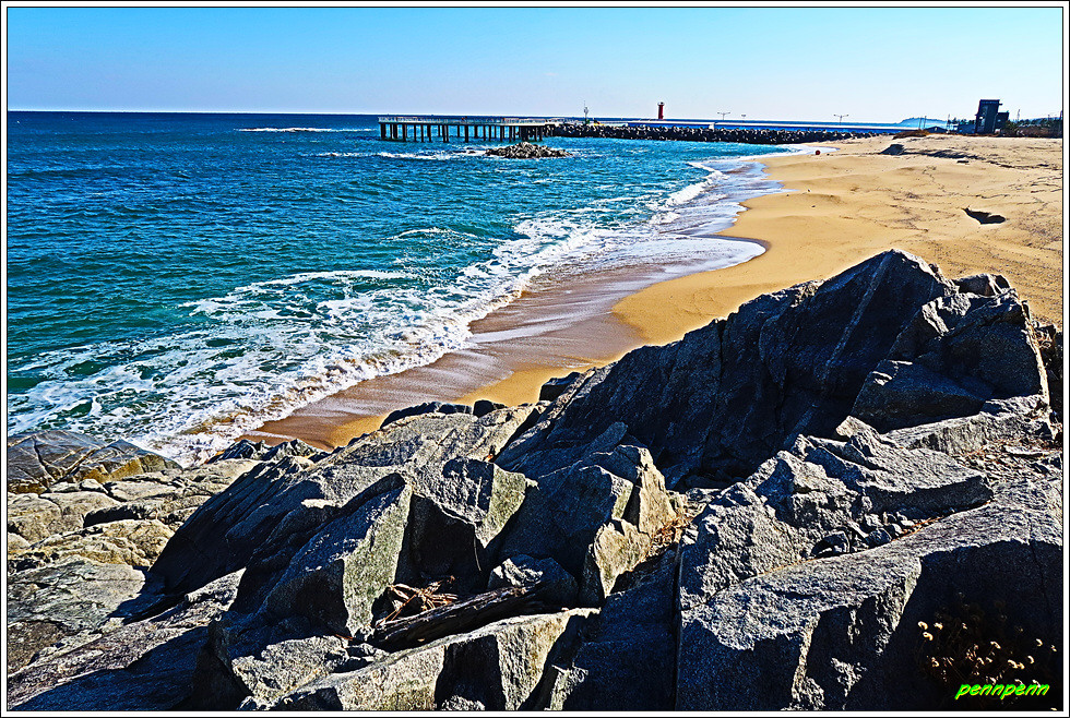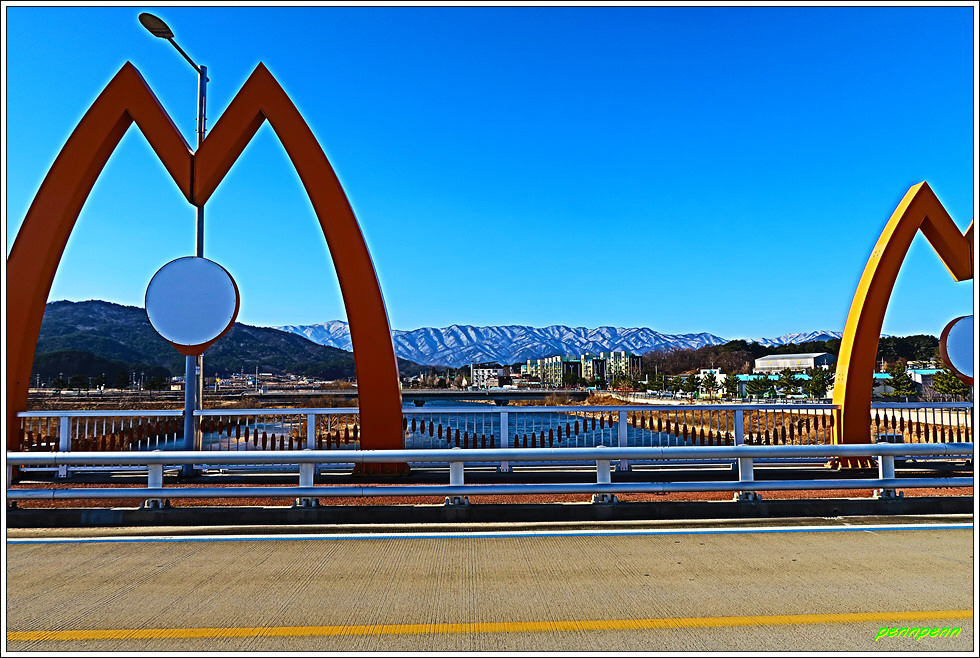 가진항을 뒤로하고 남천을 가로지르는 남천교를 건넙니다. 남천에서 서쪽을 바라보면 남쪽의 진부령에서 향로봉을 거처 북쪽 금강산에 이르는 능선이 하연 눈을 머리에 인 채 거대한 장벽처럼 서 있는 모습이 웅장합니다. 남천교를 건너 송림이 우거진 도로를 따라가노라면 풍력발전기 4기가 모습을 드러냅니다. 보통 전남 지방에서 본 풍력발전기는 단조로운데 이곳 풍력발전기는 알록달록한 색을 칠해 시각적인 아름다움을 높였고 특이 발전기 밑둥에 아담한 풍차를 설치하여 마치 예술작품 같은 모습으로 변신시켜 놓았습니다.