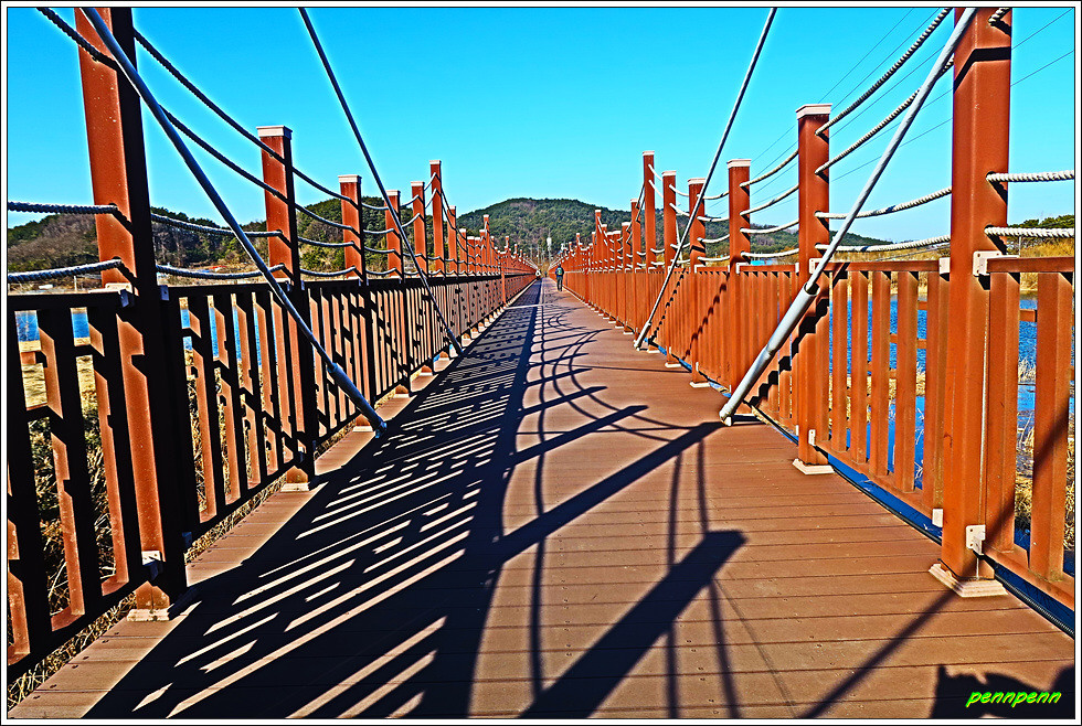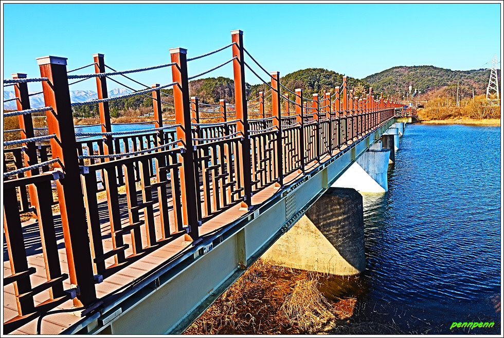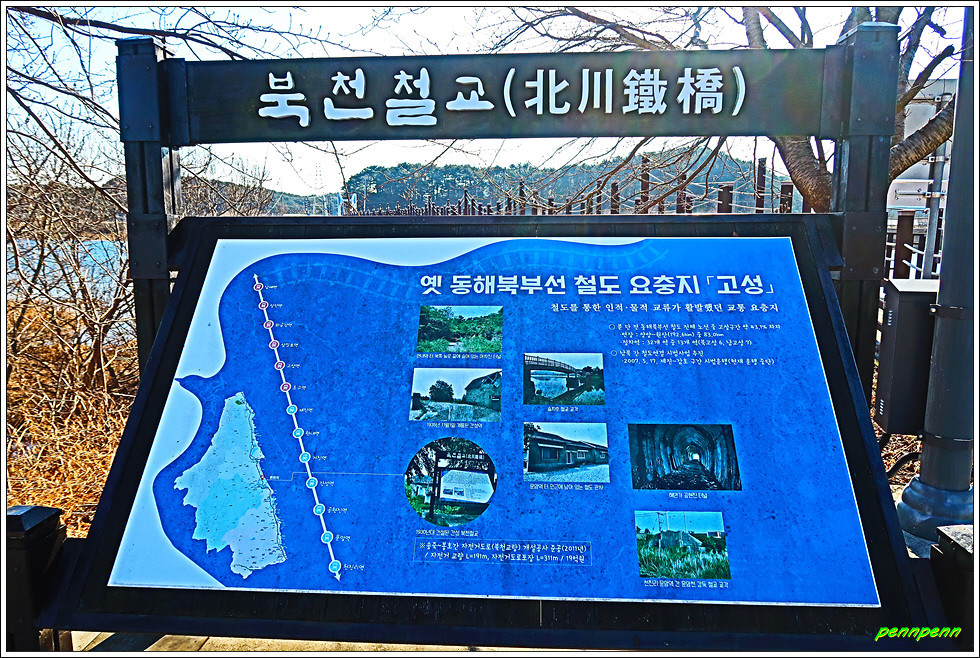 몇 백 미터를 걸어가면 북천철교인데, 고성군 간성읍 봉호리 소재 북천철교는 1930년경 일제가 자원수탈을 목적으로 원산(안변)-양양간 놓았던 동해북부선철교로서 1950년 6.25전쟁당시 북한군이 이 철교를 이용하여 군수물자를 운반하기 시작하자 아군이 함포사격으로 폭파해야만 했던 비극적인 역사의 현장입니다. 이후 이 철교는 60여 년 간 다리발(교각)만 황량하게 방치되어 있었으나 행정안전부는 평화통일을 염원하고 저탄소 녹색성장을 도모하기 위하여 접경권인 이곳을 평화누리길로 지정함에 따라 고성군은 한국철도시설공단으로부터 폐철각을 기증받아 철각을 리모델링하고 상판을 설치해 북천철교가 보행자와 자전거 마니아를 위한 전용교량으로 재탄생하게 되었습니다.