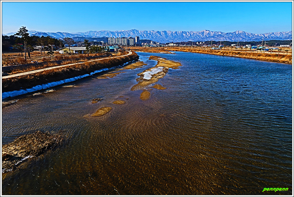 풍력발전기를 지나 북천을 따라 서쪽으로 갑니다. 북천은 강원도 고성군 간성읍을 북동류하여 동해로 흘러드는 강으로 길이는 26km입니다. 북천은 고성군청의 북쪽으로 흐르는데 고성군청의 남쪽에는 아까 지나온 남천이 흐릅니다. 향로봉 동쪽 사면을 따라 흐르는 북천은 물이 맑고 수량이 많아 좋은 피서지·휴양지로 각광을 받고 있으며 강의 상류에는 진부령과 알프스 스키장이 있습니다.