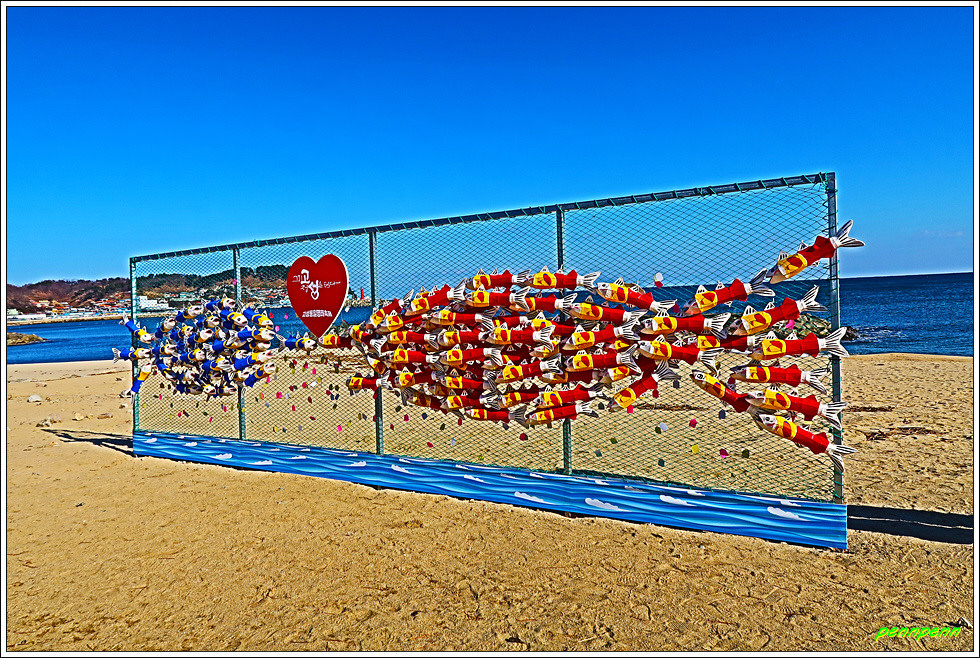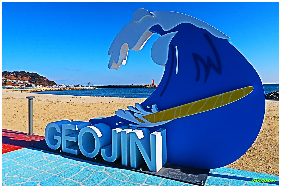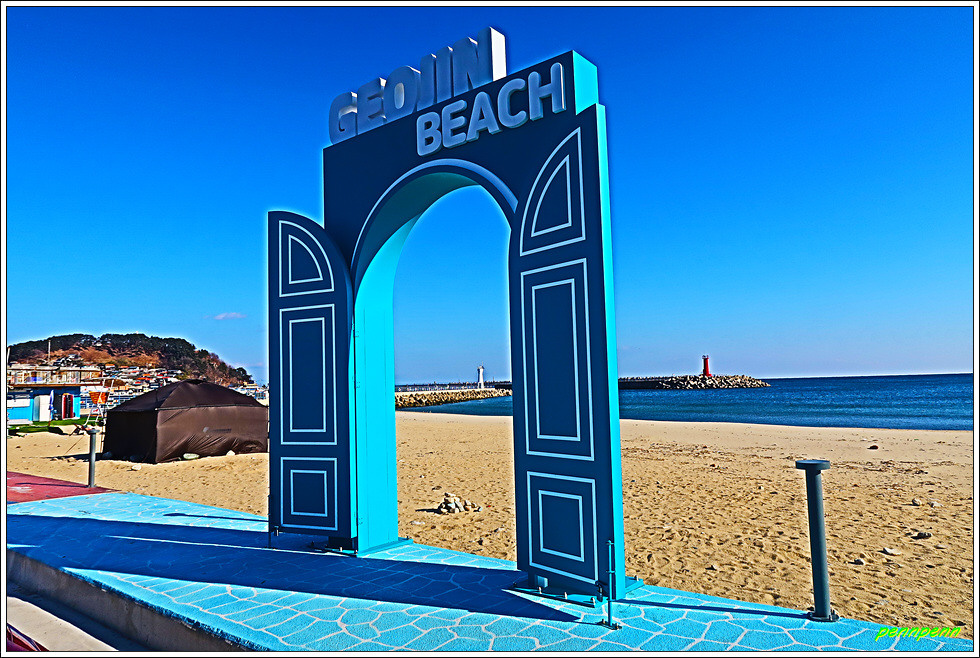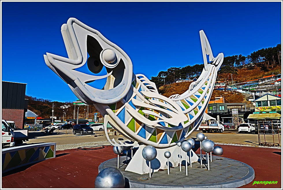 반암항을 지나 북쪽으로 발걸음을 옮기면서 해변가에 솟은 기암에 올라 바라보는 북쪽과 남쪽의 풍경이 일품입니다. 기암을 지나면 드디어 거진해변이 보이기 시작합니다. 송포교차로에는 명태조형물이 세워져 있군요. 오션상떼빌아파트를 지나 거진1교를 건너갑니다. 명태웰빙타운 인근의 거진해변에는 사진 촬영포인트인 각종 조형물이 세워져 있네요. 이러한 조형물은 공공미술프로젝트의 일환으로 조성된 것이랍니다.