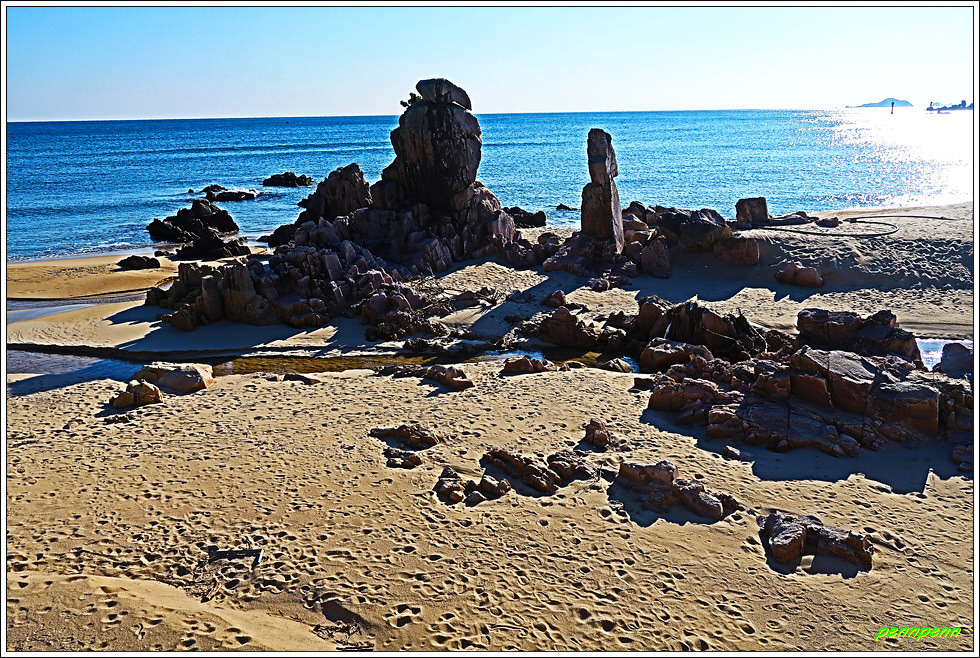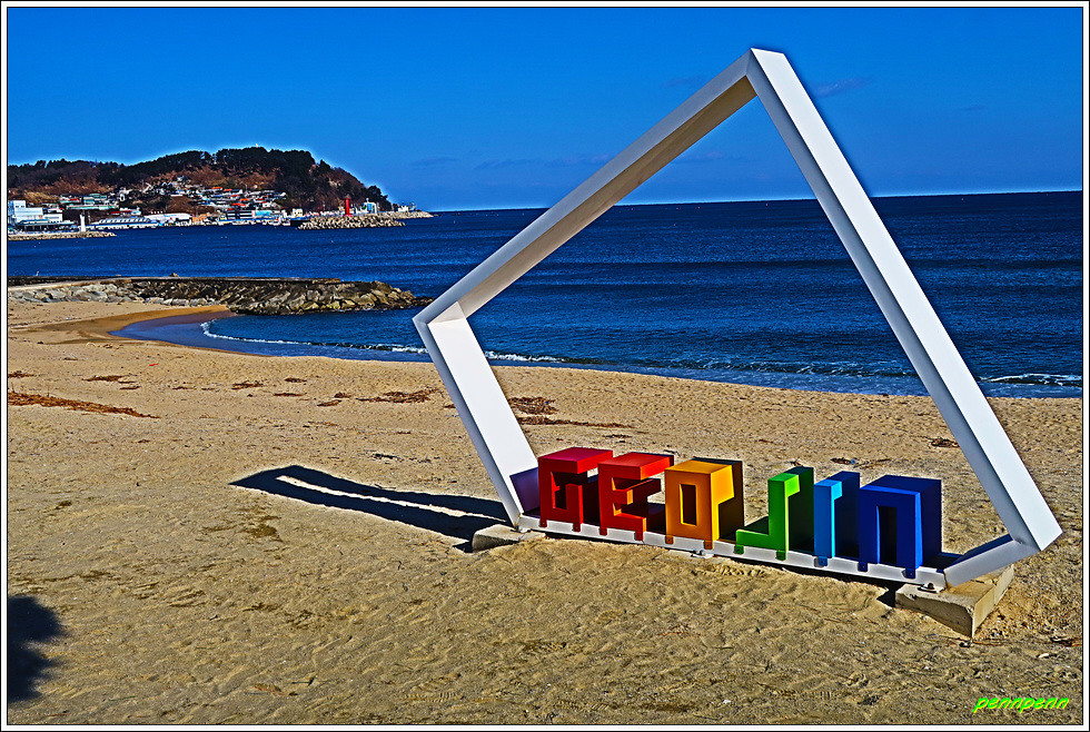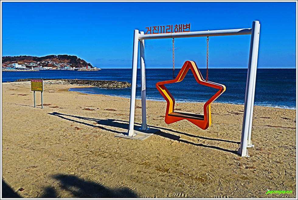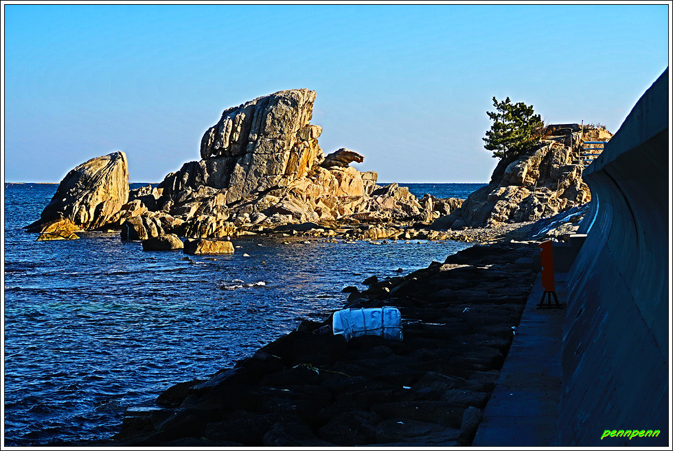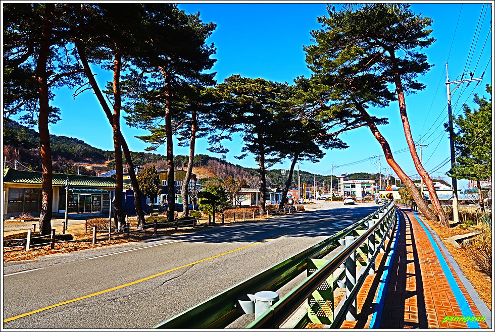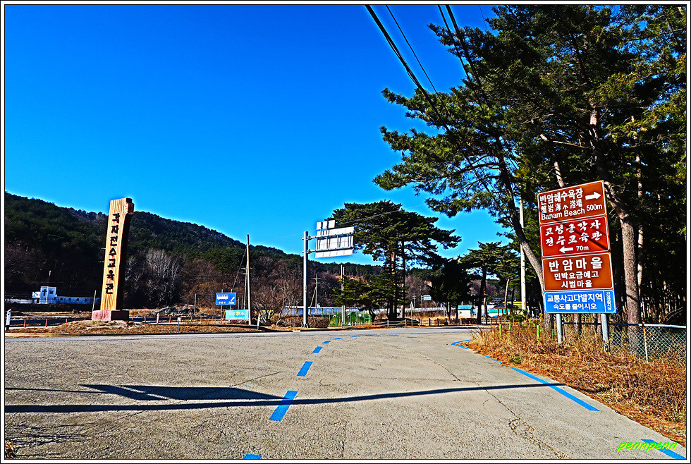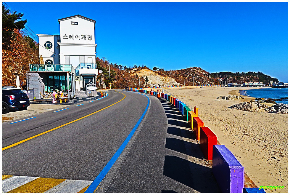 해안송림을 지나면 반암마을인데, 도로변에는 각자전수교육관이 있습니다. 각자는 나무나 돌에 글자를 파서 새김을 말하거나(刻字), 도안이나 무늬로 쓰이는 네모난 글자를 말하기도 합니다(角字). 반암마을은 거의 대부분이 민박 또는 펜션인 것처럼 보일 정도로 숙박업소 간판이 많은데 해오름도 그 중의 하나입니다.