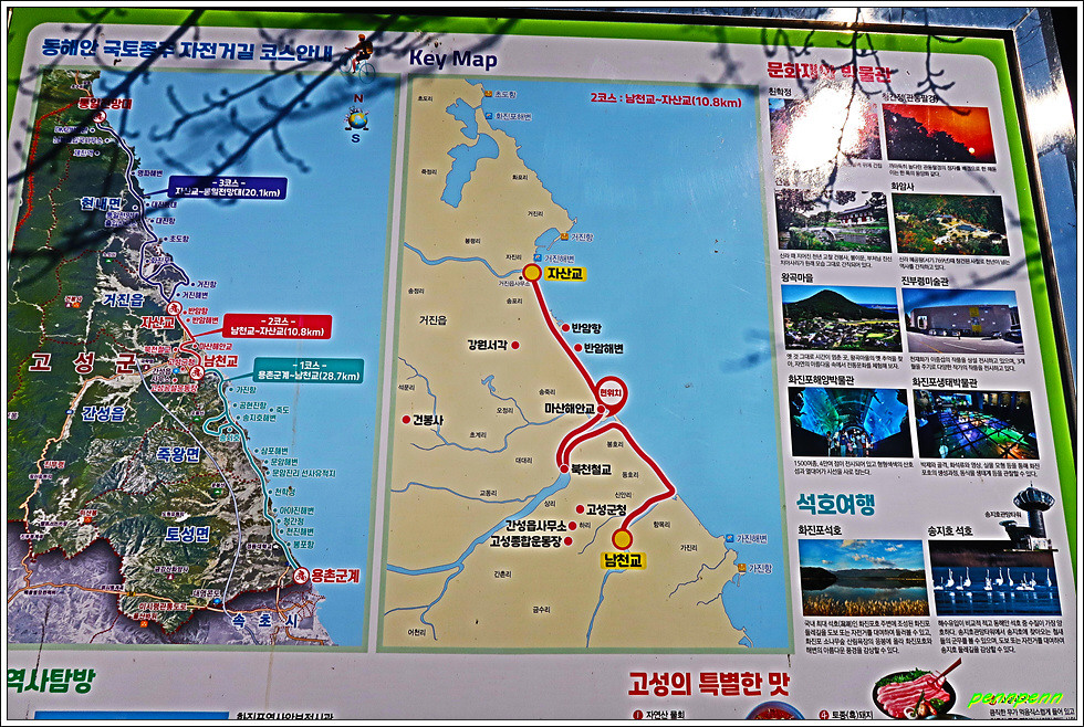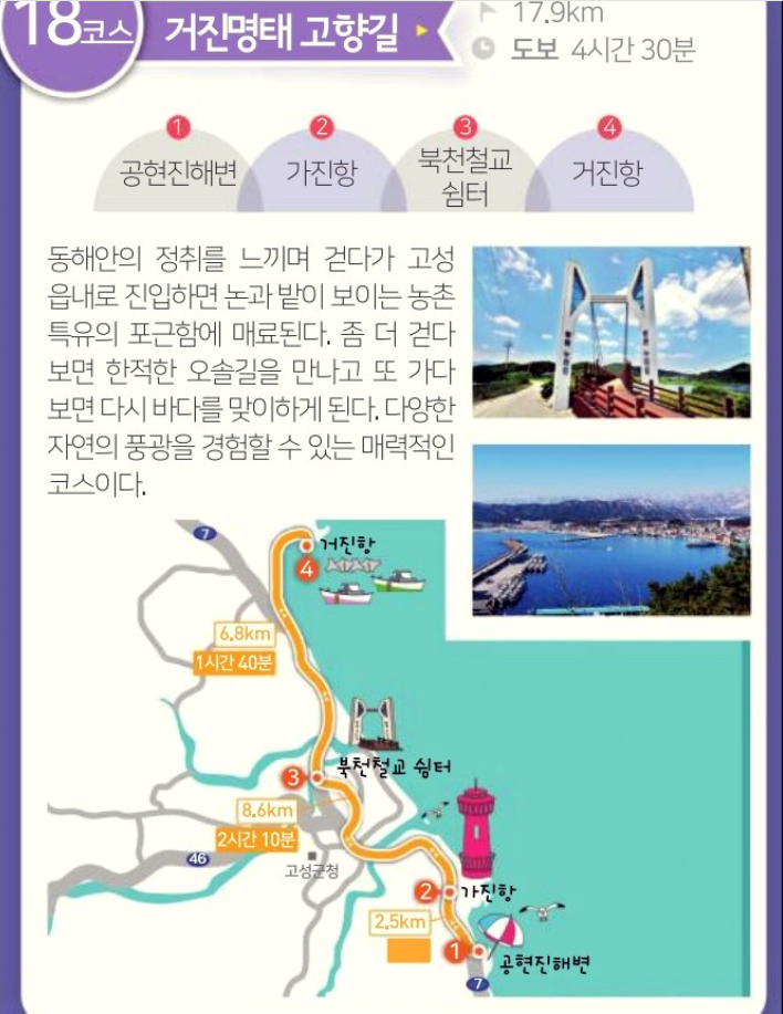 ▲ 코스 : 공현진항-공현진해변 수뭇개배위-가진항-남천1교-풍력발전기-북천철교-마산해안교-해안송림-반암해변-반암항-거진1교-거진해변-거진항