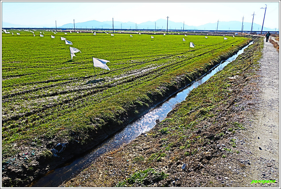 직선으로 달리던 방조제는 좌측으로 구부러져 서쪽으로 이어집니다. 현재 썰물 때라서 그런지 갯골에도 물이 거의 보이지 않네요. 정자를 지나 곰소염전 방면으로 갑니다. 신활교에는 보통 사장교에서 보는 높은 중심축이 서로 감싸는듯한 모습으로 세워져 있음이 특이하군요. 사활교를 건너 좌측으로 내려서 농로를 걸어가는데 논에 백색 깃발이 휘날리는 것은 무슨 연유인지 잘 모르겠습니다. 사람들은 아마도 농작물에 피해를 끼치는 새떼를 방지하려는 의도라고 추측했습니다.