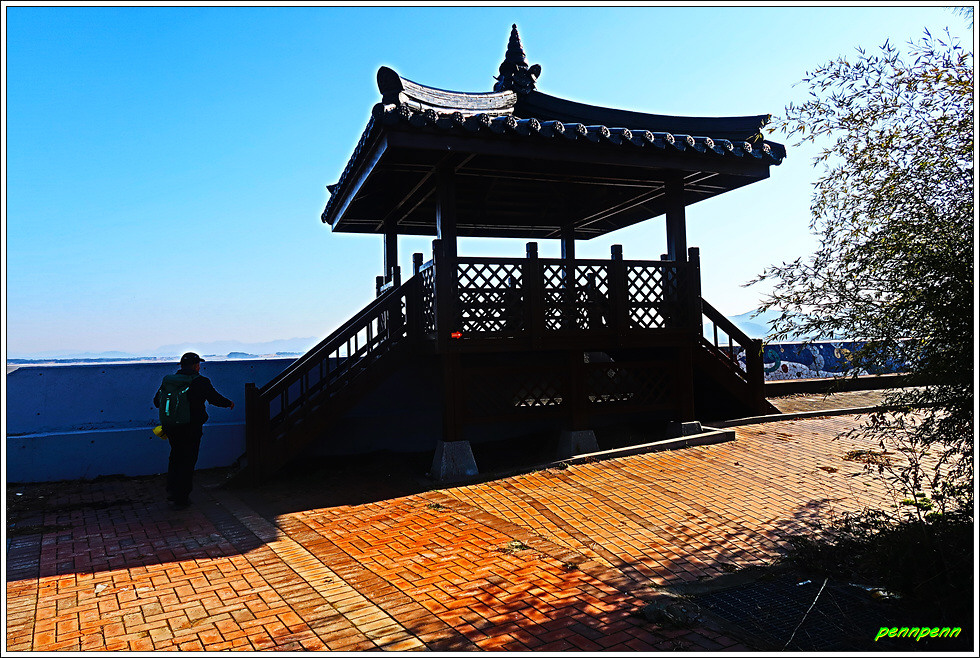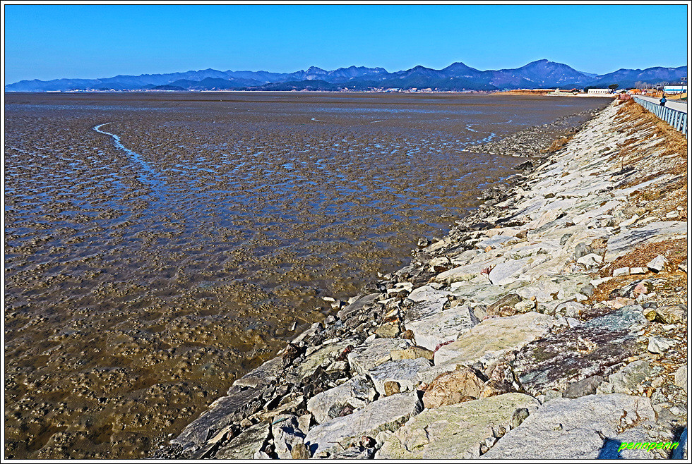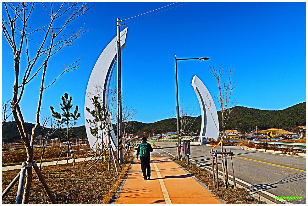 완만한 경사의 언덕을 오르면서 뒤돌아보니 농장 뒤로 고창의 산들이 긴 능선을 그리고 있습니다. 농산물이 참 잘 자랄 것 같은 황토밭에 대규모의 태양광발전패널이 설치되어 있군요. 작은 언덕을 넘으니 곰소만(구 줄포만) 뒤로 변산의 능선이 그림처럼 펼쳐집니다. 아마도 이제 고창군을 지나 부안면에 진입한 것 같습니다. 농로를 걸으며 갈대밭을 지나 침엽수립지대를 뒤로하면 오늘 코스 중 처음으로 만나는 줄포만 노을빛정원입니다.