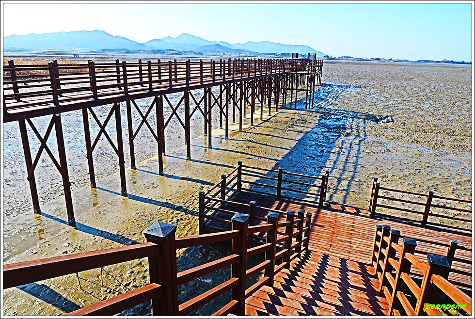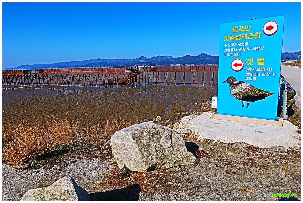 이제 부안줄포만 노을빛정원을 둘러볼 차례입니다. 부안군은 이곳의 이름을 “줄포만 갯벌생태공원”에서 “줄포만 노을빛정원”으로 변경했다고 했는데 현지의 안내문은 변경 전 그대로입니다. 참고로 줄포만은 전북 부안군 변산면 도청리 개섬과 고창군 해리면 동호리 사이에 있는 만으로, 너비 약 7㎞, 길이 약 17㎞, 수심 10m 미만인 이곳에는 개펄이 넓게 발달되어 있습니다. 만안에는 죽도(竹島)ㆍ대죽도(大竹島) 등 작은 섬들이 있습니다. 그런데 과거에는 이곳의 대표어항인 줄포의 이름을 따서 줄포만이라고 했지만 현재는 이곳의 가장 큰 어항이자 경제활동중심지인 곰소의 이름을 따서 곰소만이라고 부릅니다.