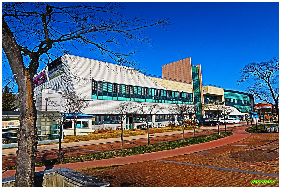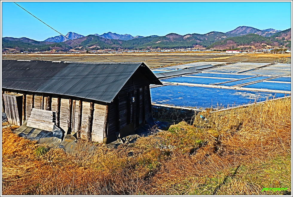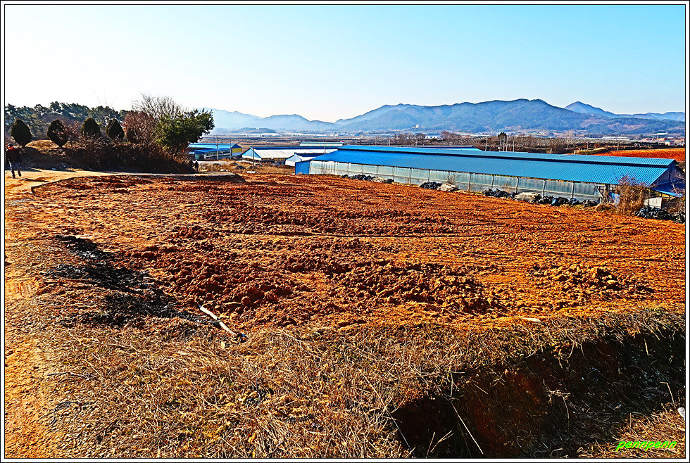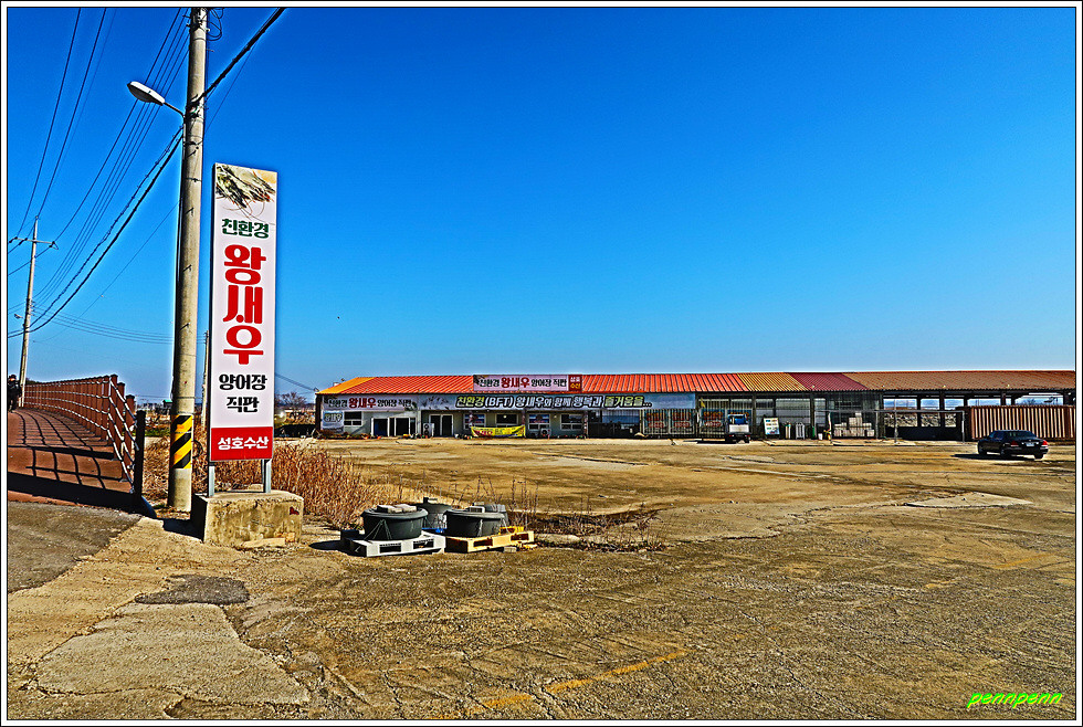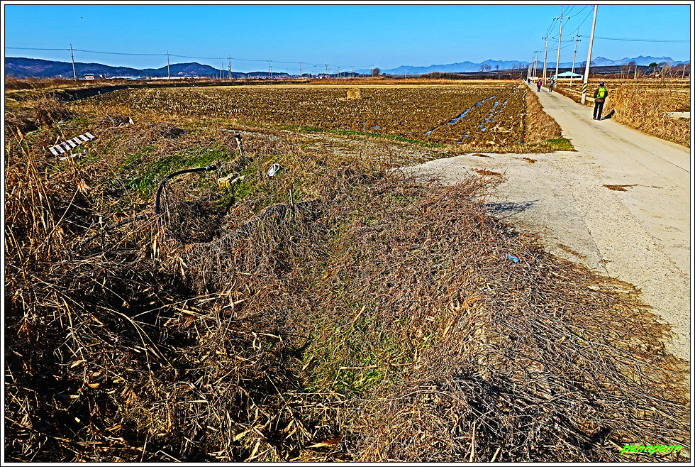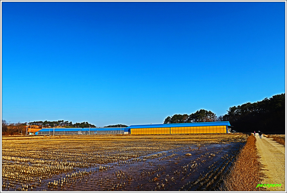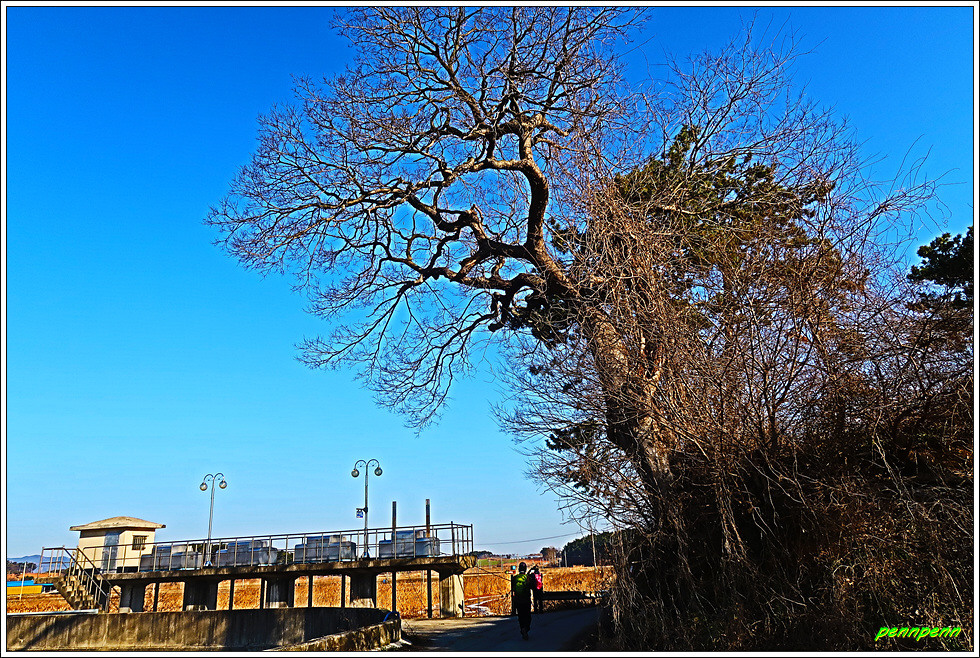 지금 걷는 이 길은 해안문화마실길인데 배수 갑문 옆에는 줄기가 휘어진 거목이 길손의 머리 위로 휘늘어져 있습니다. 들판사이의 농로를 지나가는데 길섶에는 누렇게 물든 갈대가 산들바람에 나부낍니다. 규모가 엄청 커 보이는 시아농장을 지나가는데 축사에는 가축이 한 마리도 보이지 않는 게 의아할 따름입니다.