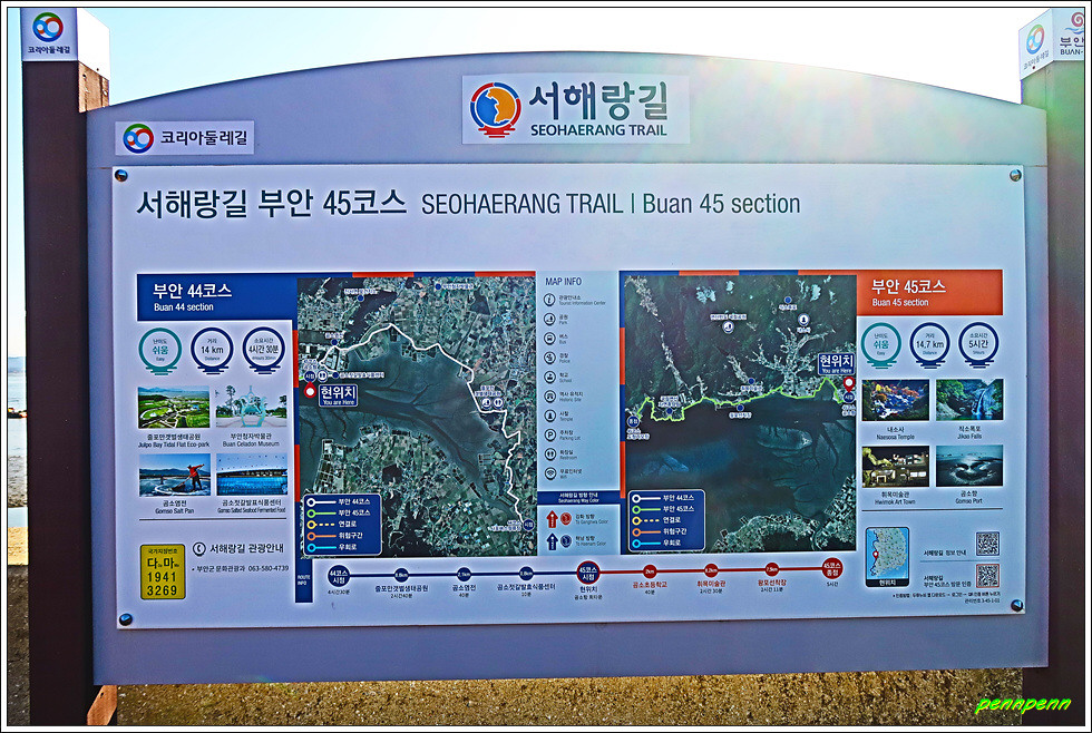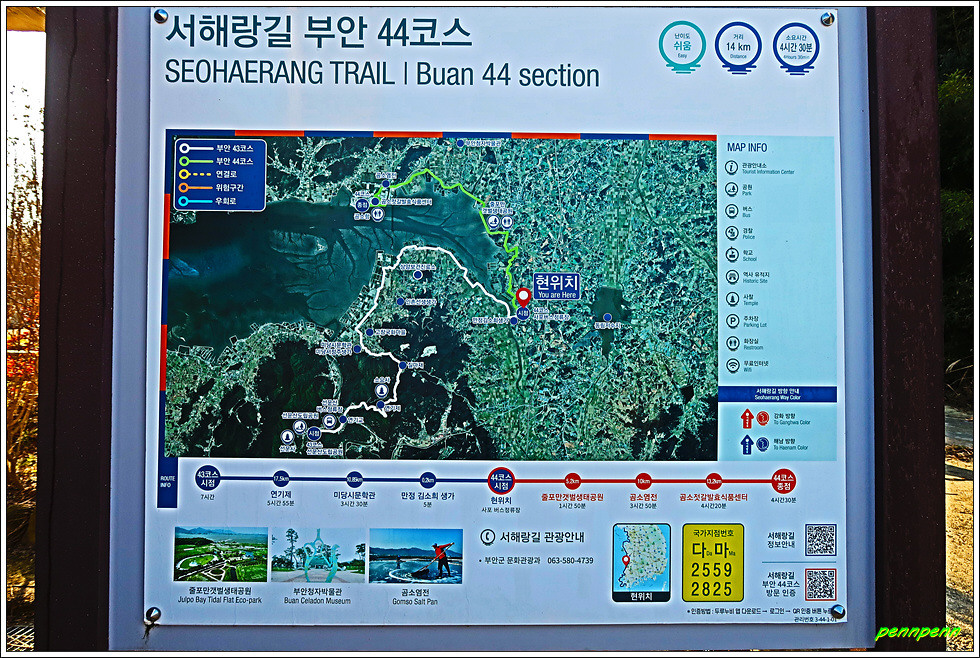 서해랑길 부안 44코스는 고창군 사포버스정류장에서 출발해 부안군 진서면 곰소리 곰소항회타운에 이르는 14km의 도보길로, 드라마 촬영지로도 유명한 갈대군락지 “부안 줄포만 노을빛정원”(구 줄포만생태갯벌공원)을 만납니다. 이번 코스부터는 공식적으로 부안코스(7개 코스)의 시작입니다.