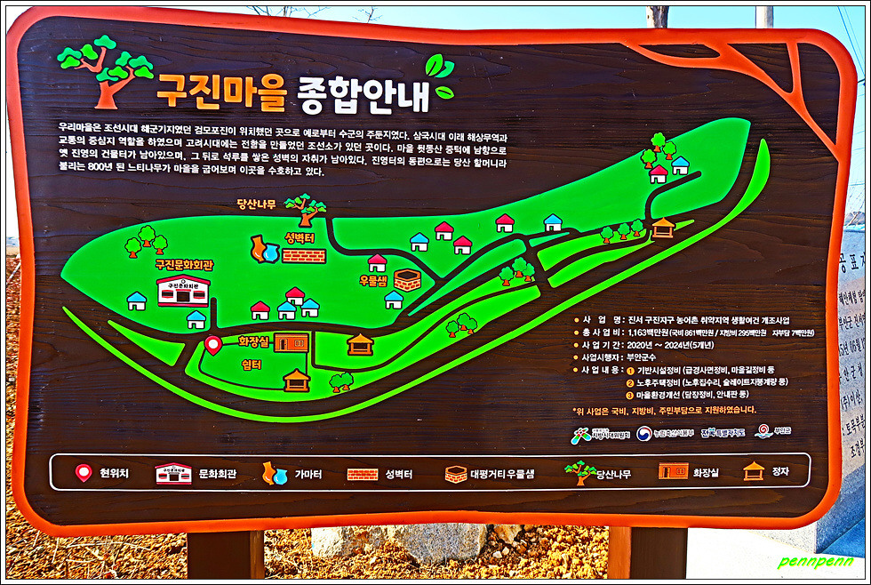 구진마을로 들어섰는데 동네 뒤 언덕에 우람한 체격의 고목이 한그루 보이더군요. 현지 안내문을 보니 800년 묵은 당산나무라 불리는 느티나무라고 합니다. 구진마을은 삼국시대 이래 해상무역과 교통의 중심지였으며 고려시대에는 전함을 만들던 조선소가 있던 곳이랍니다. 당산나무가 있는 마을 뒷산에 옛 진영의 건물터가 남아 있답니다.