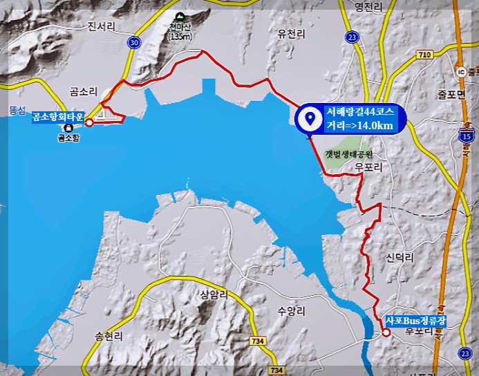 ▲ 코스 : 사포버스정류장-시아농장-줄포만노을빛정원-운연조대-신활교-구진마을-곰소염전-곰소항회센터
