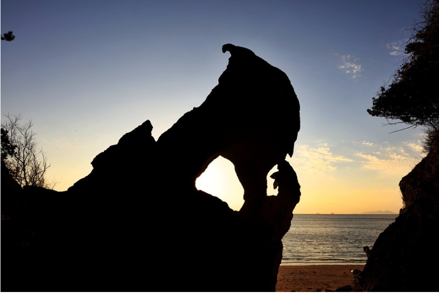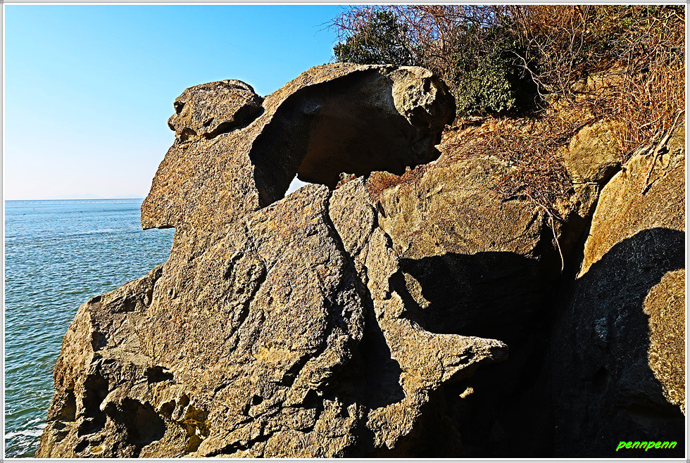 이곳 삼거리에서 좌측으로 약 50여 미터만 가서 나무데크를 내려서면 해변가 기암지대에 해골바위 또는 생각하는 바위가 신비한 모습으로 방문객을 맞아줍니다. 이 바위가 생긴 모습이 보는 각도에 따라 해골바위로도 보이고 또 조각가 로뎅의 걸작품 “생각하는 사람” 모습을 닮아 이런 이름을 지은 듯합니다.