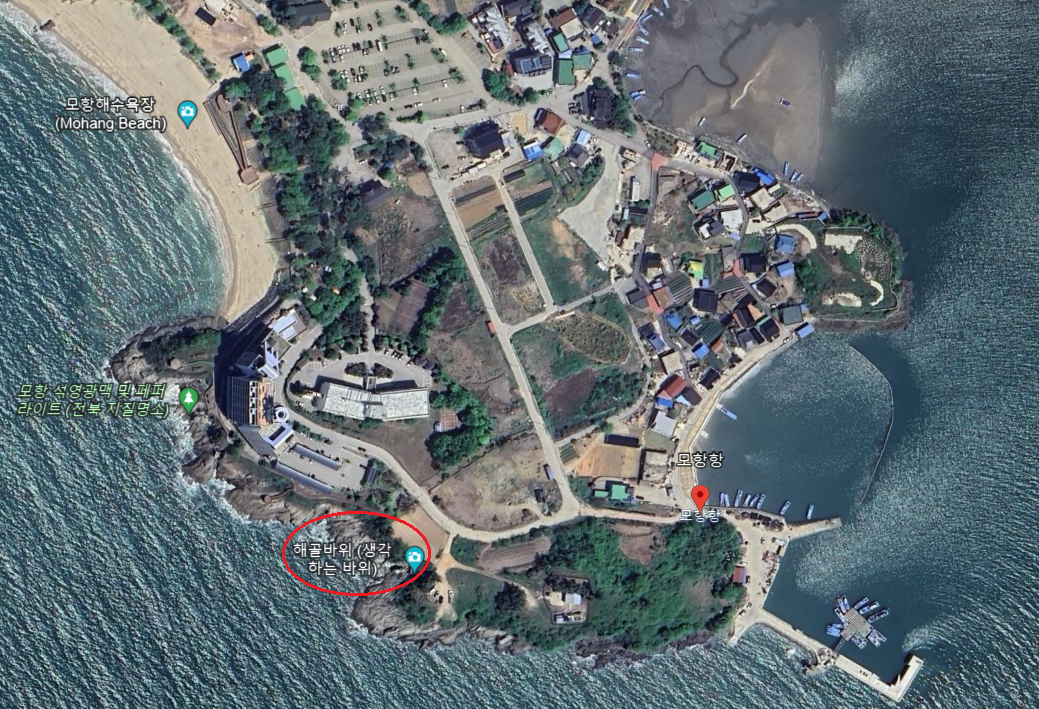 이곳 모항은 전북 서해안권 국가지질공원 명소 6곳(직소폭포, 적벽강, 채석강, 솔섬, 모항, 위도) 중 하나인데 이를 보여주는 상징적인 바위가 해변가에 숨어 있지만 이정표나 안내문이 없어 방문객들은 모르고 지나치기 십상입니다. 모항항에서 북쪽으로 조금 가노라면 삼거리 갈림길이 나오는데 여기서 북쪽을 보면 좌측에는 모항해나루 가족호텔, 우측에는 현대해상 변산연수원이 있습니다.