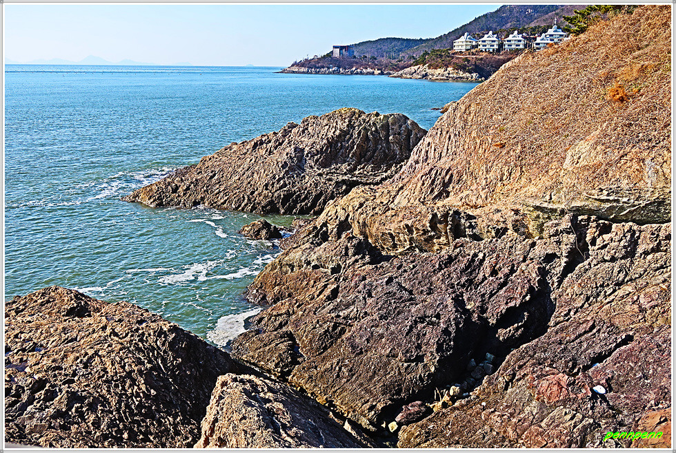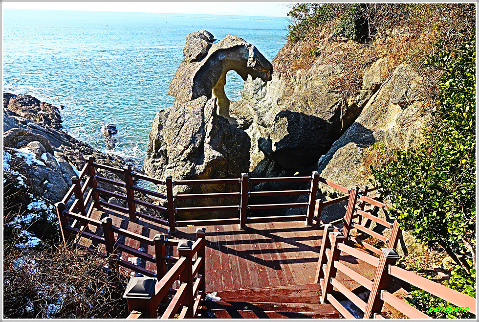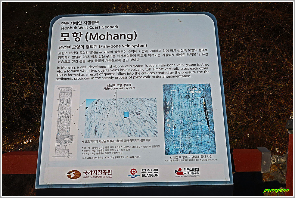 모항해나무가족호텔을 지나면서 해변가의 기암을 감상합니다. 암반 위 데크에는 “생선뼈 모양의 광맥계”가 있다는 안내문이 있지만 읽어보아도 워낙 전문용어라서 무슨 소리인지 잘 모르겠습니다. 해나무가족호텔을 돌아가면 모항해수욕장입니다.