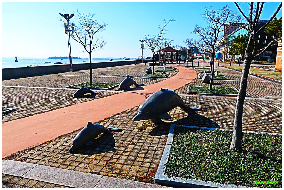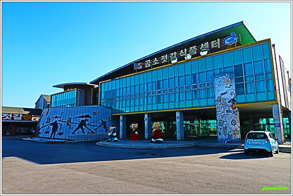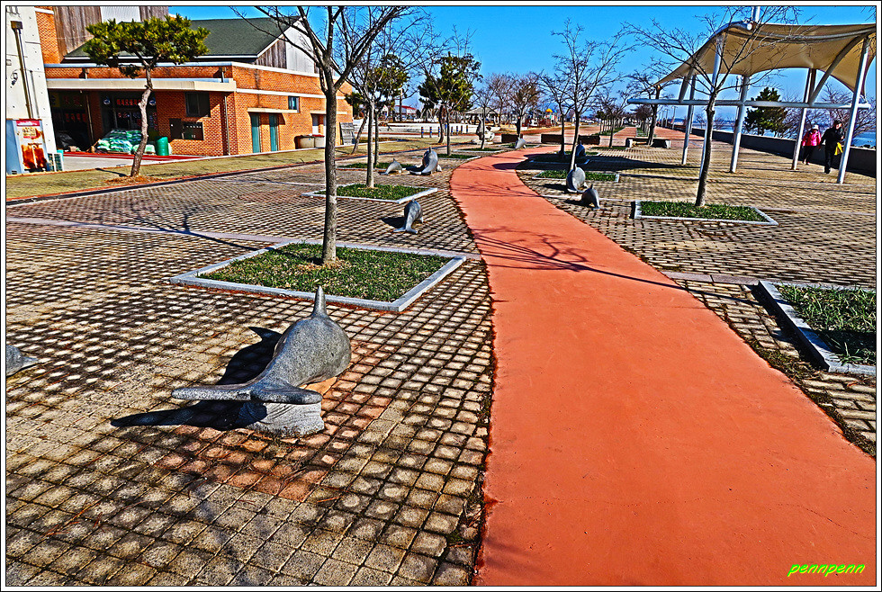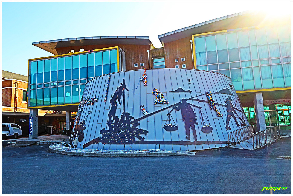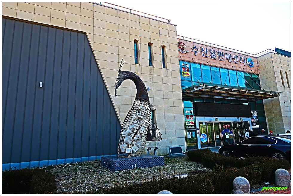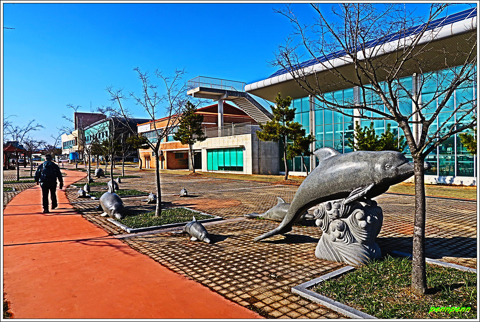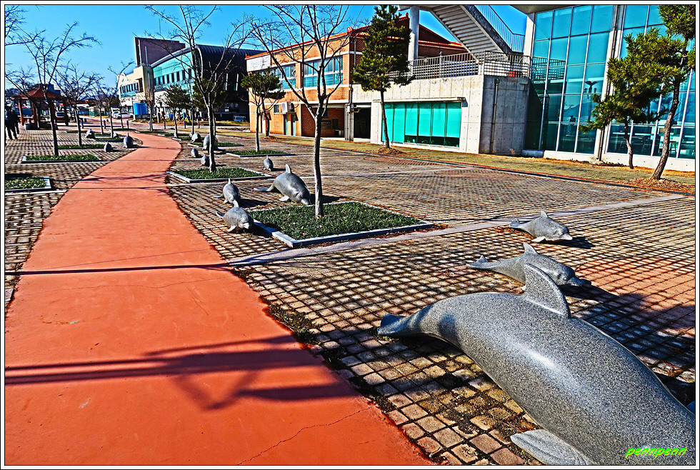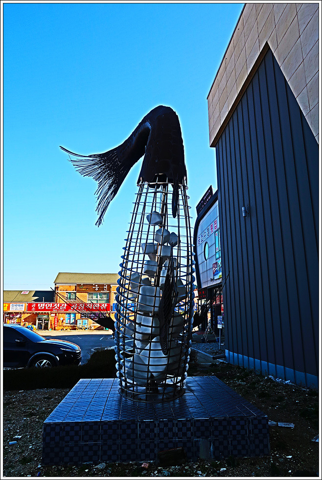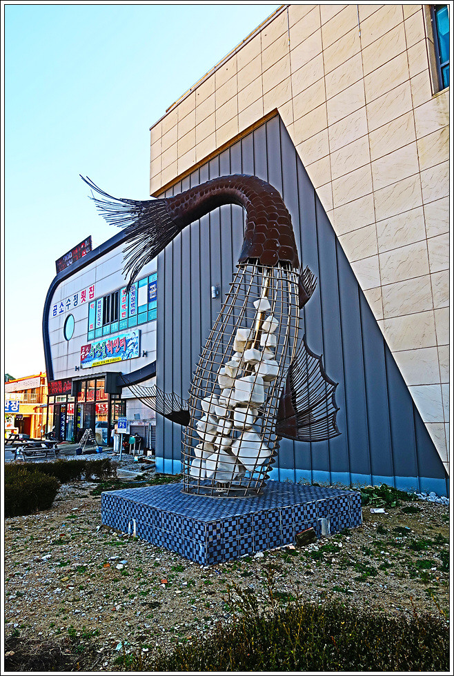 판매센터 뒤쪽 바닷가에는 새우와 노인을 형상화한 조형물이 있고, 여기서부터 동쪽으로 가는 길목에는 여러 마리의 돌고래(?)처럼 보이는 물고기가 행진하는 모습의 조형물이 놓여 있어 행인의 발걸음을 멈추게 만듭니다. 좌측으로 젓갈타운이 보이는군요.