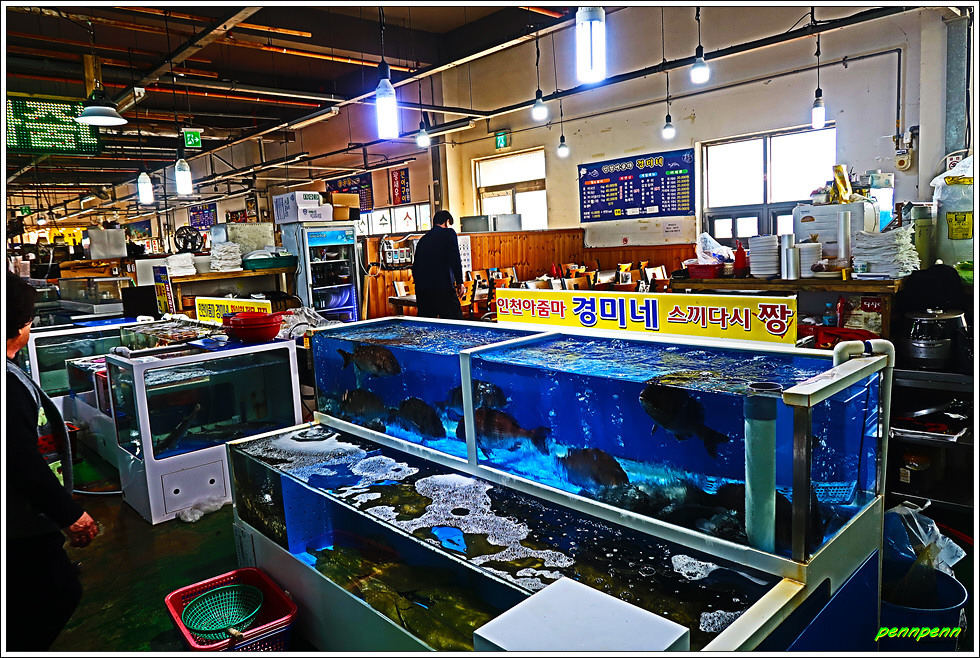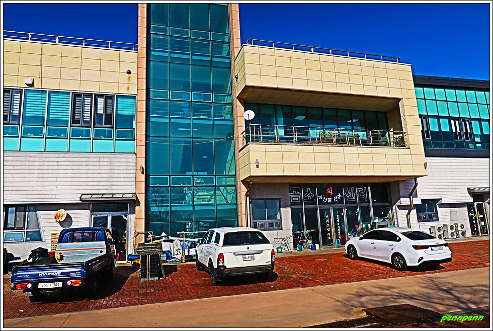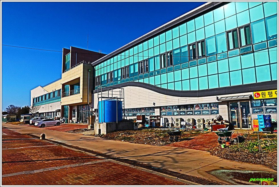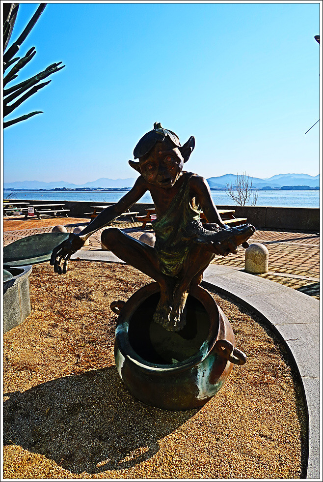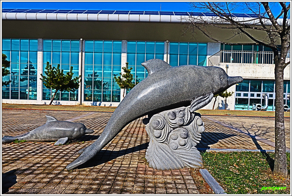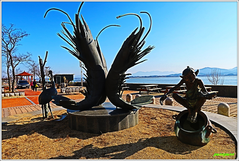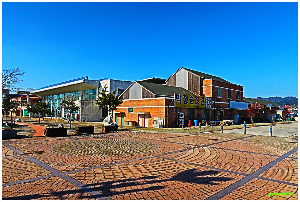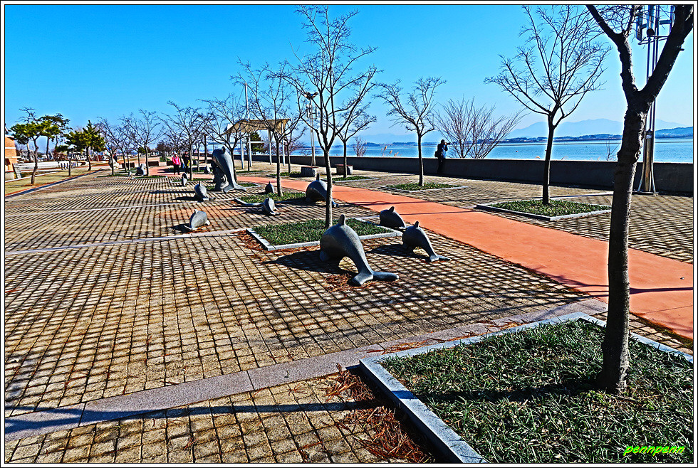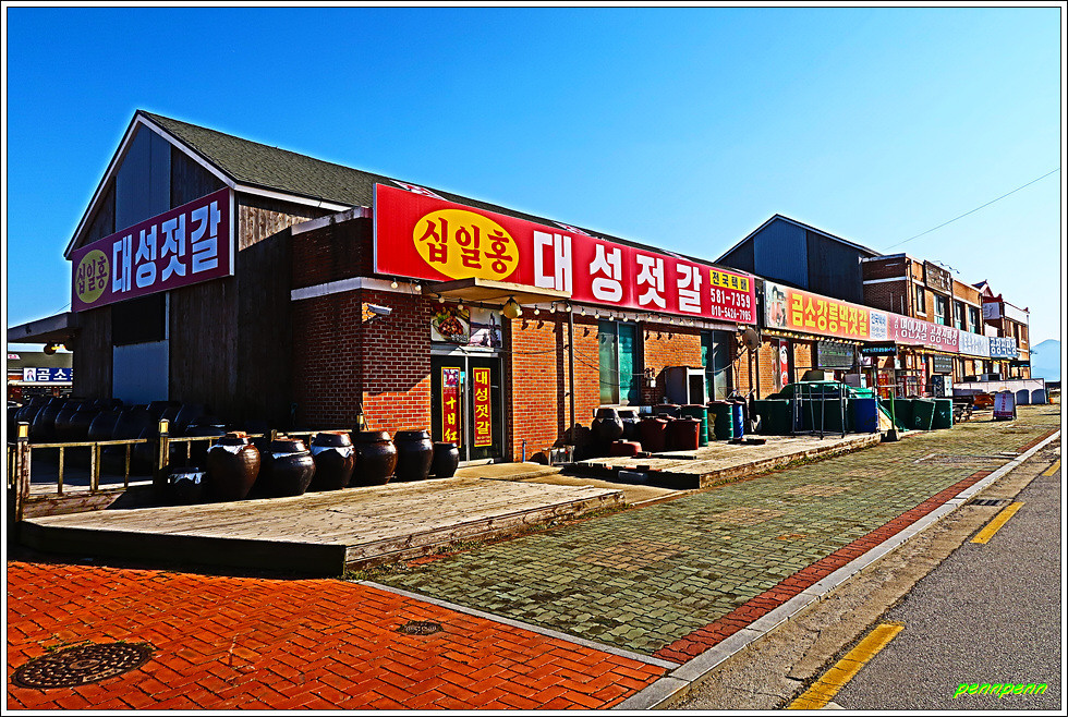 판매센터 뒤쪽 바닷가에는 새우와 노인을 형상화한 조형물이 있고, 여기서부터 동쪽으로 가는 길목에는 여러 마리의 돌고래(?)처럼 보이는 물고기가 행진하는 모습의 조형물이 놓여 있어 행인의 발걸음을 멈추게 만듭니다. 좌측으로 젓갈타운이 보이는군요.