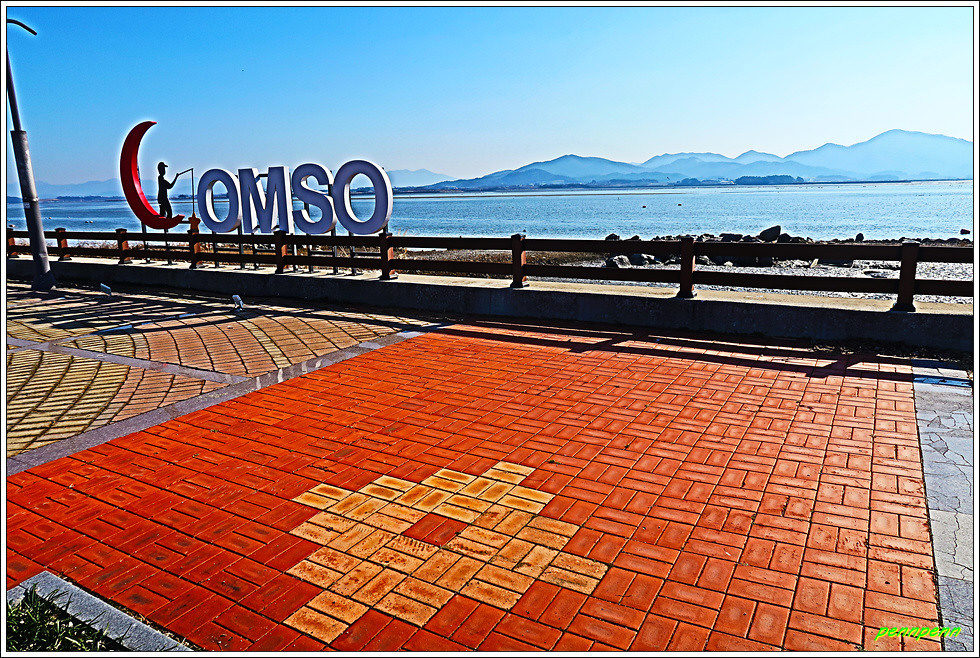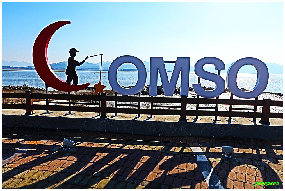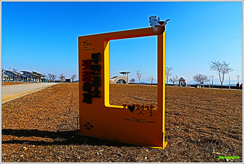 어린이 놀이터가 있는 해변에는 곰소항을 의미하는 영문글씨 곰소(GOMSO)가 세워져 있는데 곰(GOM)을 나타내는 영문 G를 낚시꾼으로 표현한 것을 재치라고 봐야할지는 미지수로군요. 소라로 만든 음료수대도 보이고, 부안곰소 젓갈축제를 알리는 사진액자틀로 세워져 있습니다.