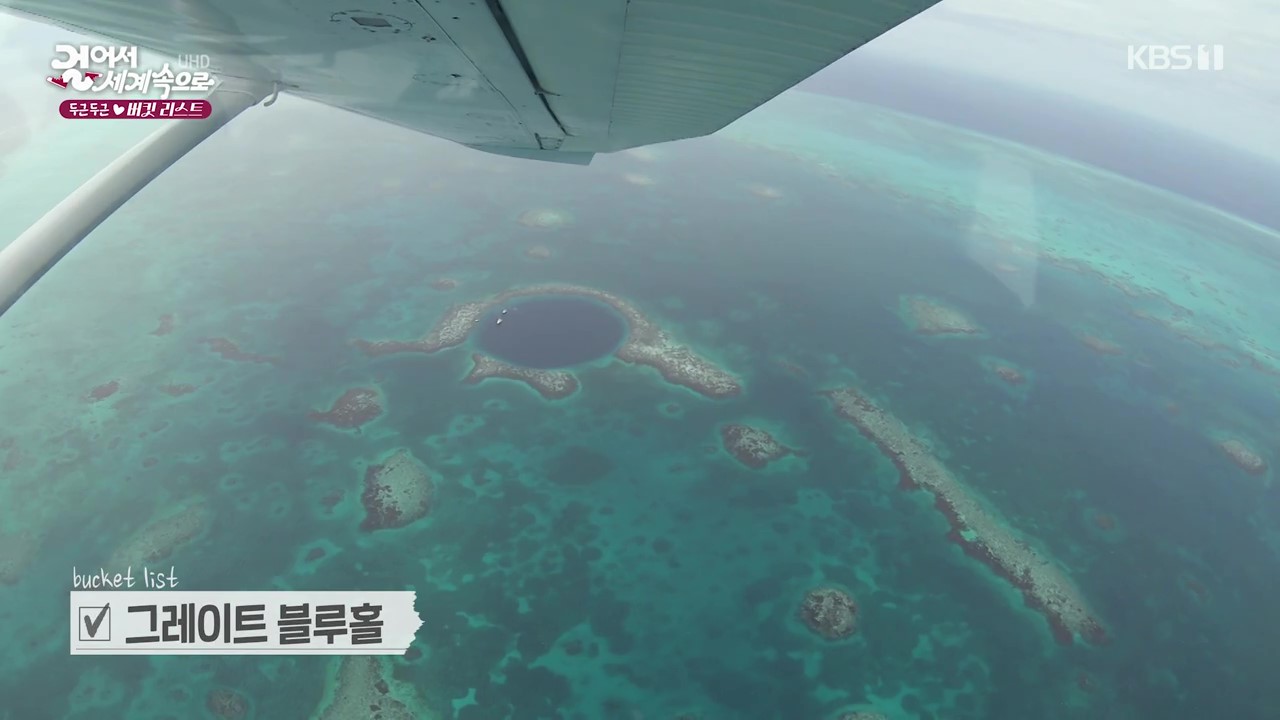 경비행기를 타고 바다로 나가 그레이트 블루홀(지름 1,000m, 깊이 400m)을 중심으로 한 산호초 보호지역을 내려다봅니다. 키코크 섬은 인구 1,300여명의 작은 섬이지만 천천히 걷기를 실천하는 사람들이 살고 있습니다. 물속으로 들어가 스노클링을 하면서 산호초와 물고기들을 만납니다.