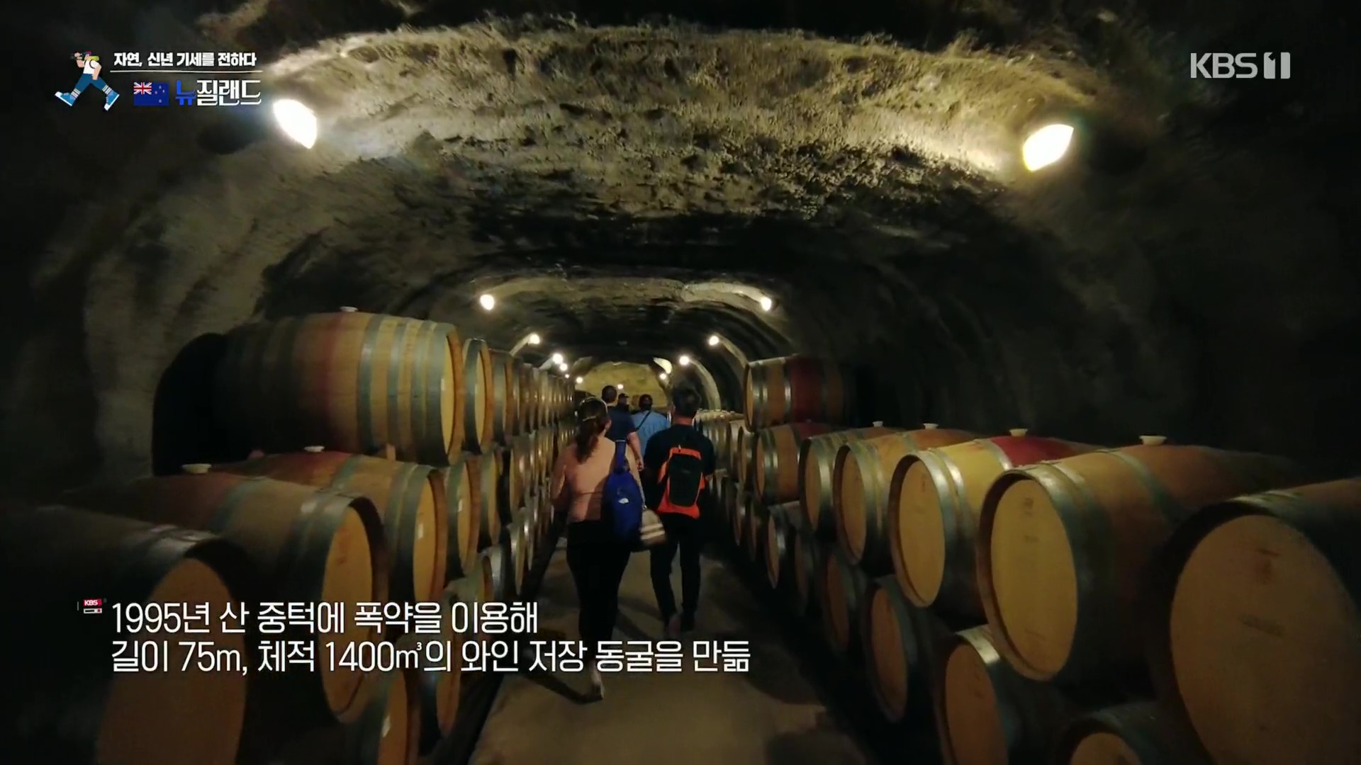 빙하가 깎은 계곡 옆은 포도밭입니다. 산중턱에 만든 거대한 동굴에서 포도주를 숙성시켜는데 연평균 기온이 항상 14도를 유지한답니다. 현재는 규제로 인해 뉴질랜드에서 동굴저장소는 단 2개뿐입니다.