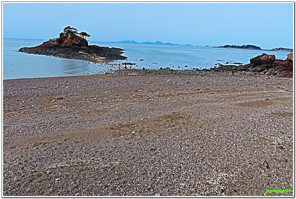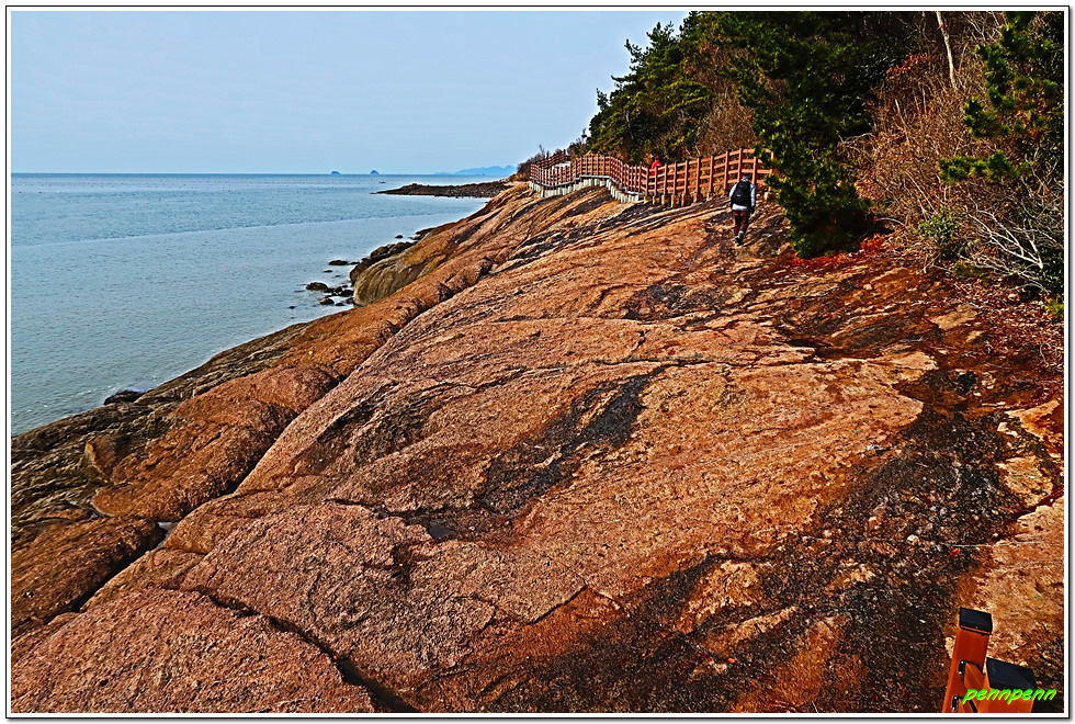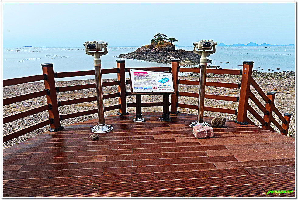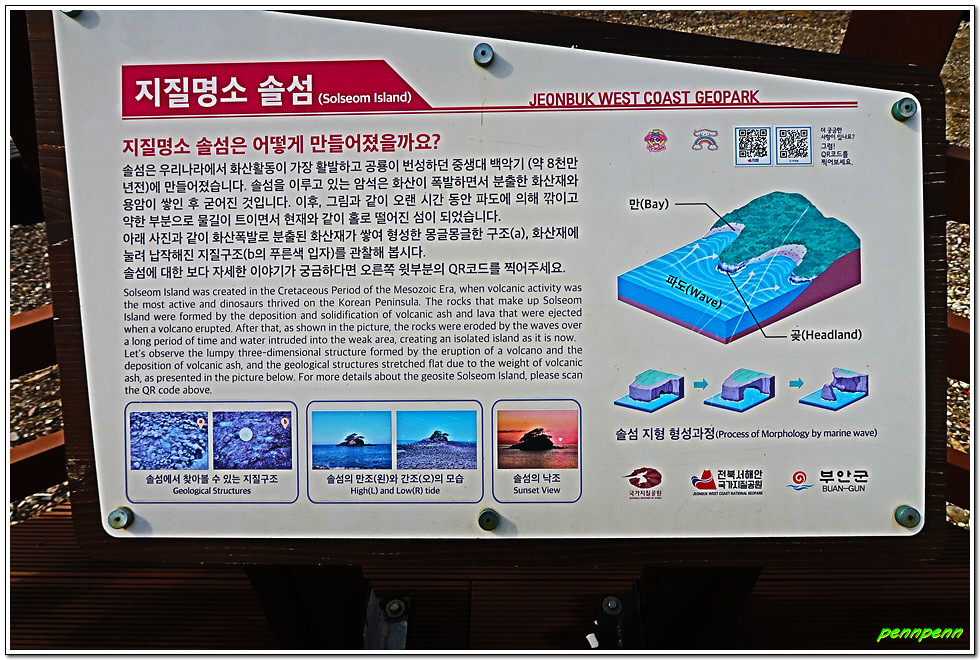 정자를 지나가는데 해안가 암석의 색상도 여러 가지입니다. 두 번째 정자를 지나면 실버샌드드라이브 경관쉼터 안내문이 있는 도청리쉼터입니다. 쉼터에서 30번 국도를 잠시 만난 후 다시 좌측으로 진입합니다. 한 구비를 돌아가니 솔섬이 보이는데 육안으로는 초라하게 보여도 부안에서 가장 유명한 해넘이장소입니다.